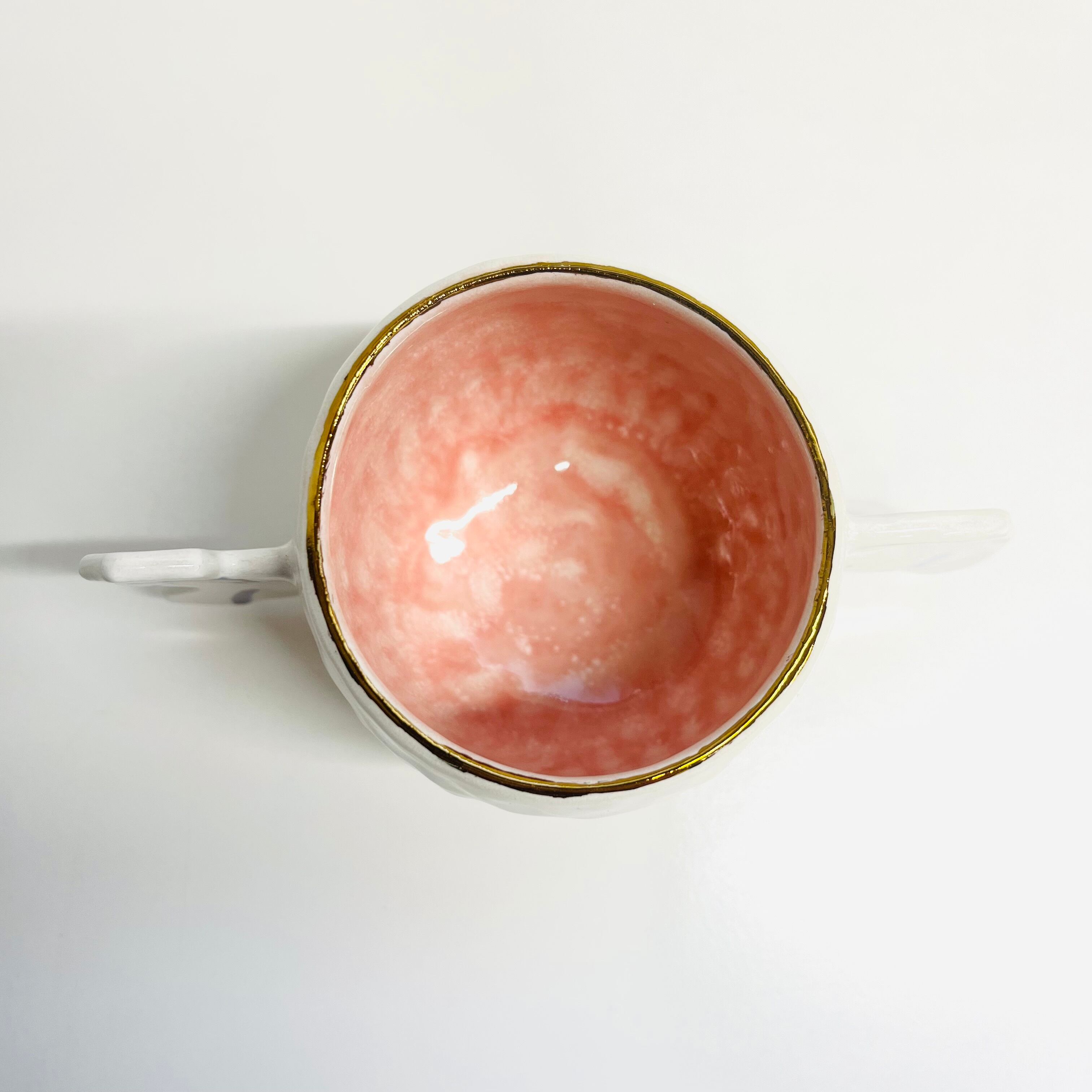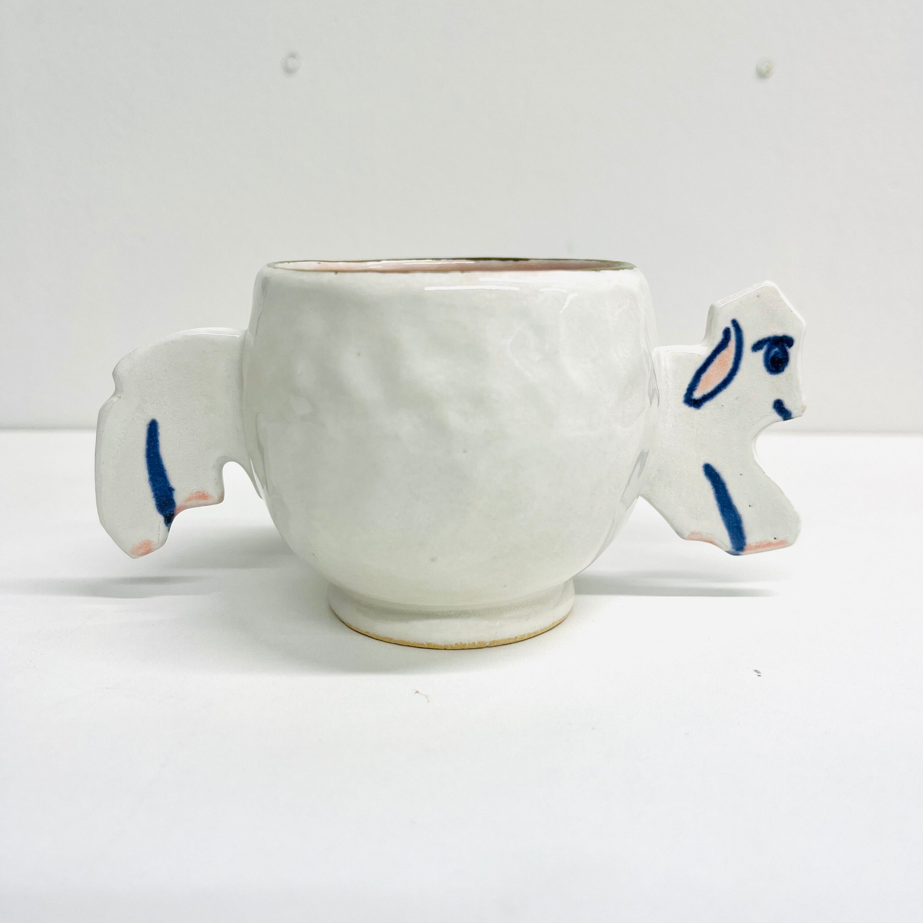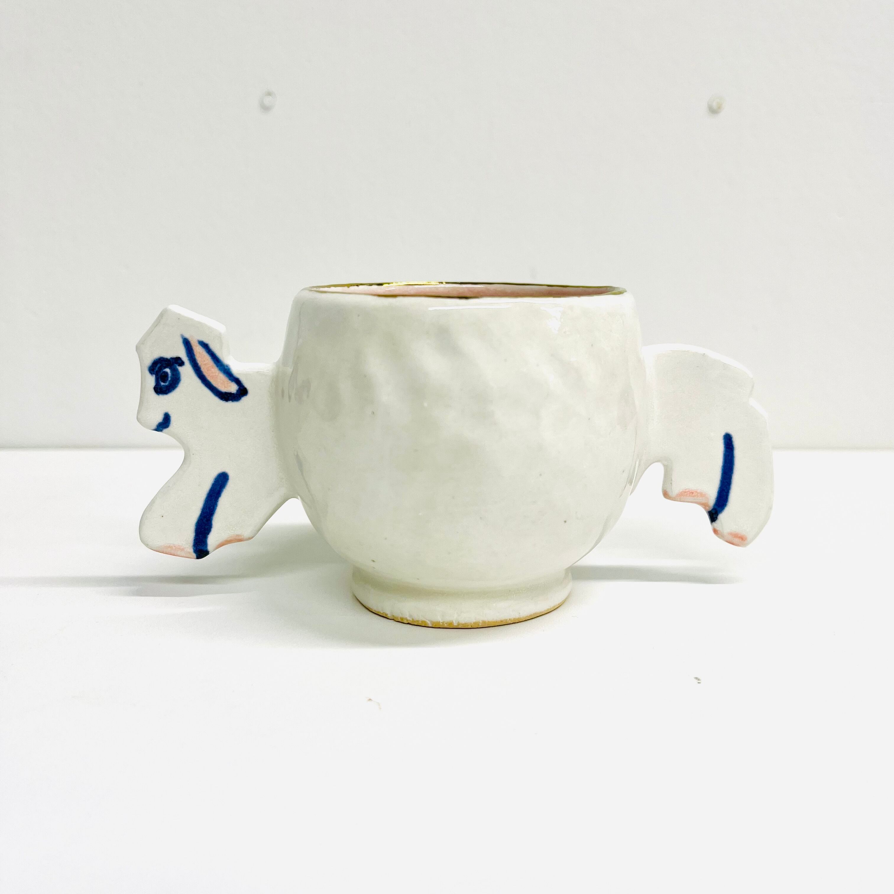 子羊が元気よく飛び出て、持ち手になっているカップです。使用すればする程味わいが出てくる白い釉薬です。