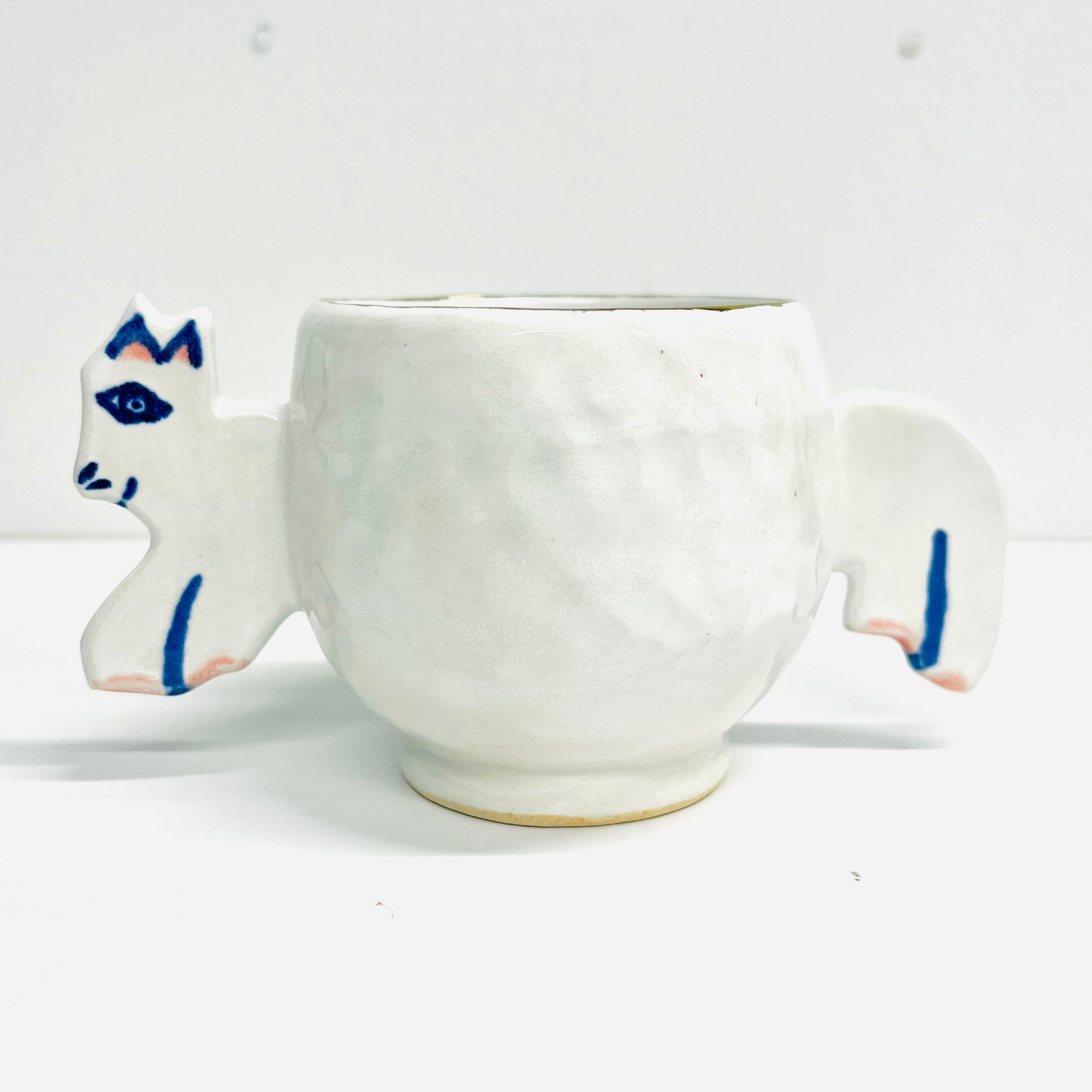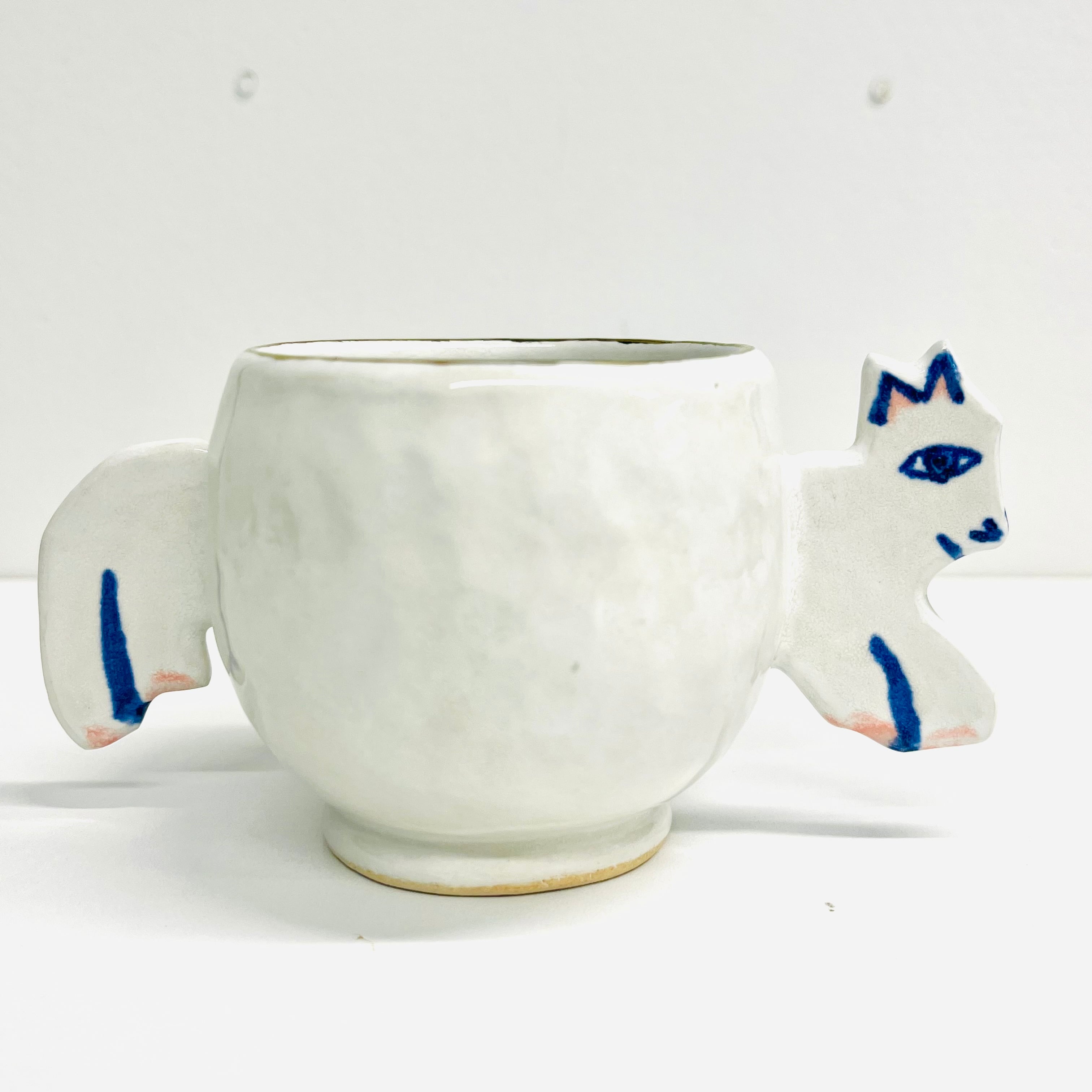 動物が元気よく飛び出て、持ち手になっているカップです。白い釉薬が施され、使い込む程にその魅力が増していき、毎日の日常に温かみを添えてくれます。