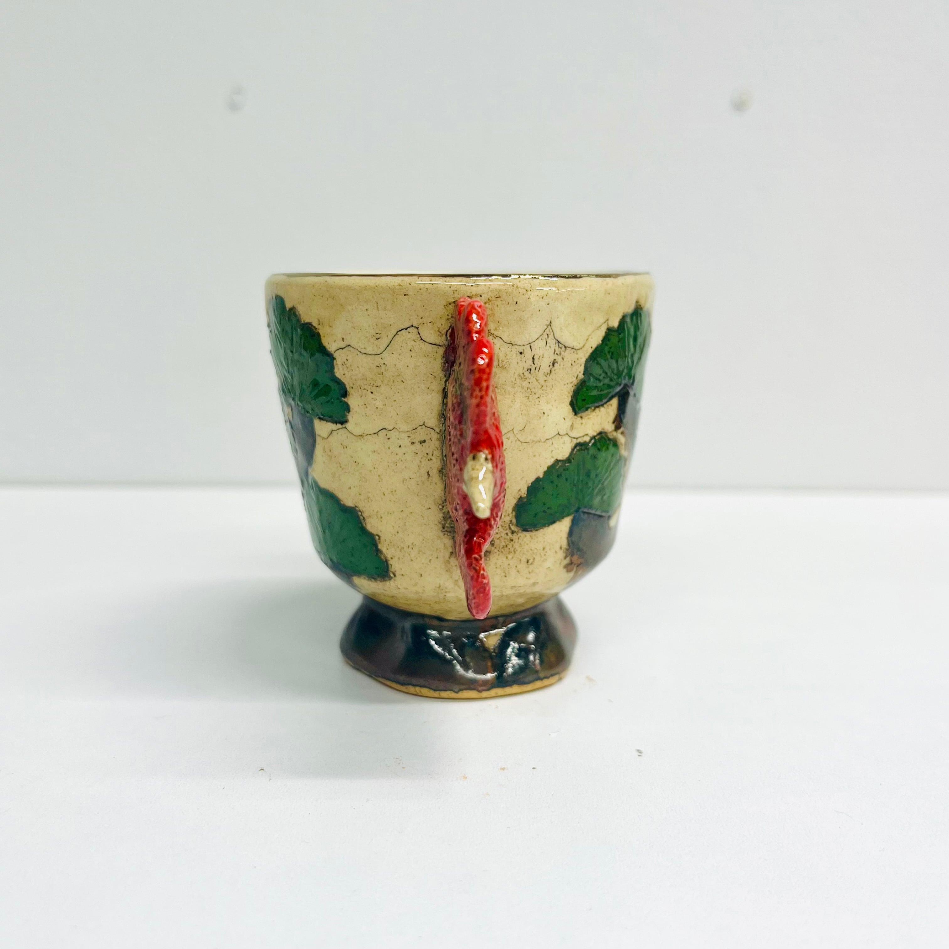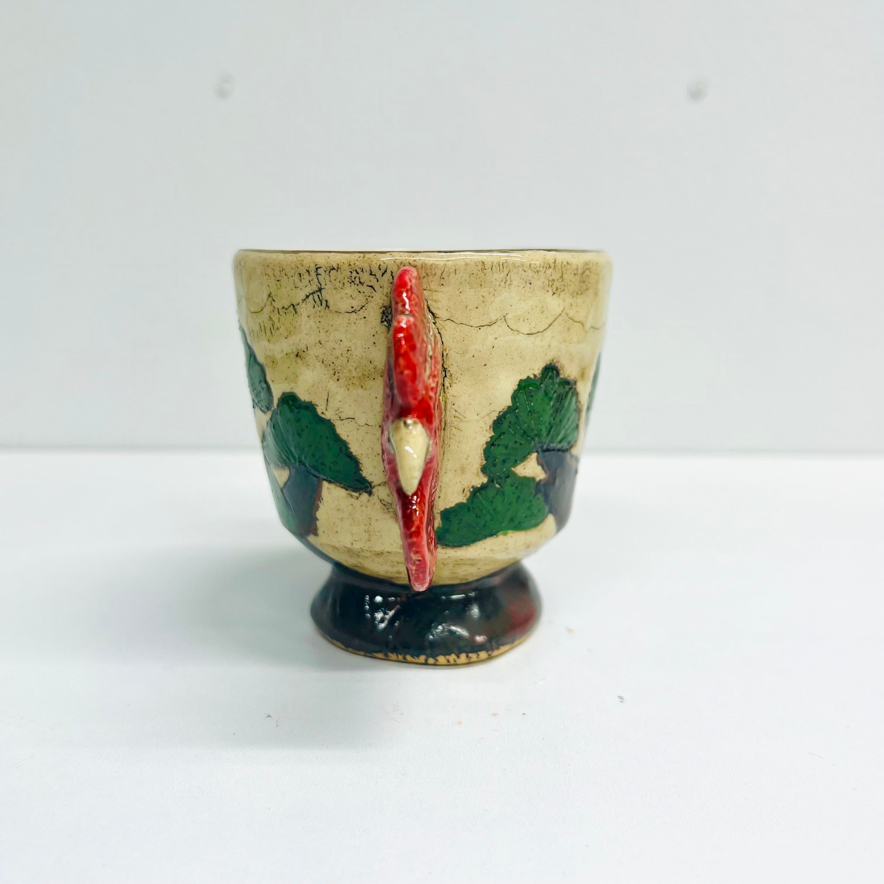 言葉遊びを視覚化したデザインに、SANZOKU賞の「スイカのイカの部分」に通じる面白さを感じました。「双耳」と呼ばれる二つの持ち手がある伝統的なデザインを、鶏の頭部に見立てることで、古典的な様式と遊び心が見事に融合しています。また、松(不老長寿)と鶏(明けの鳥)という縁起の良い組み合わせも吉祥性が高く、多くの人に喜ばれるデザインになっています。(yukki)