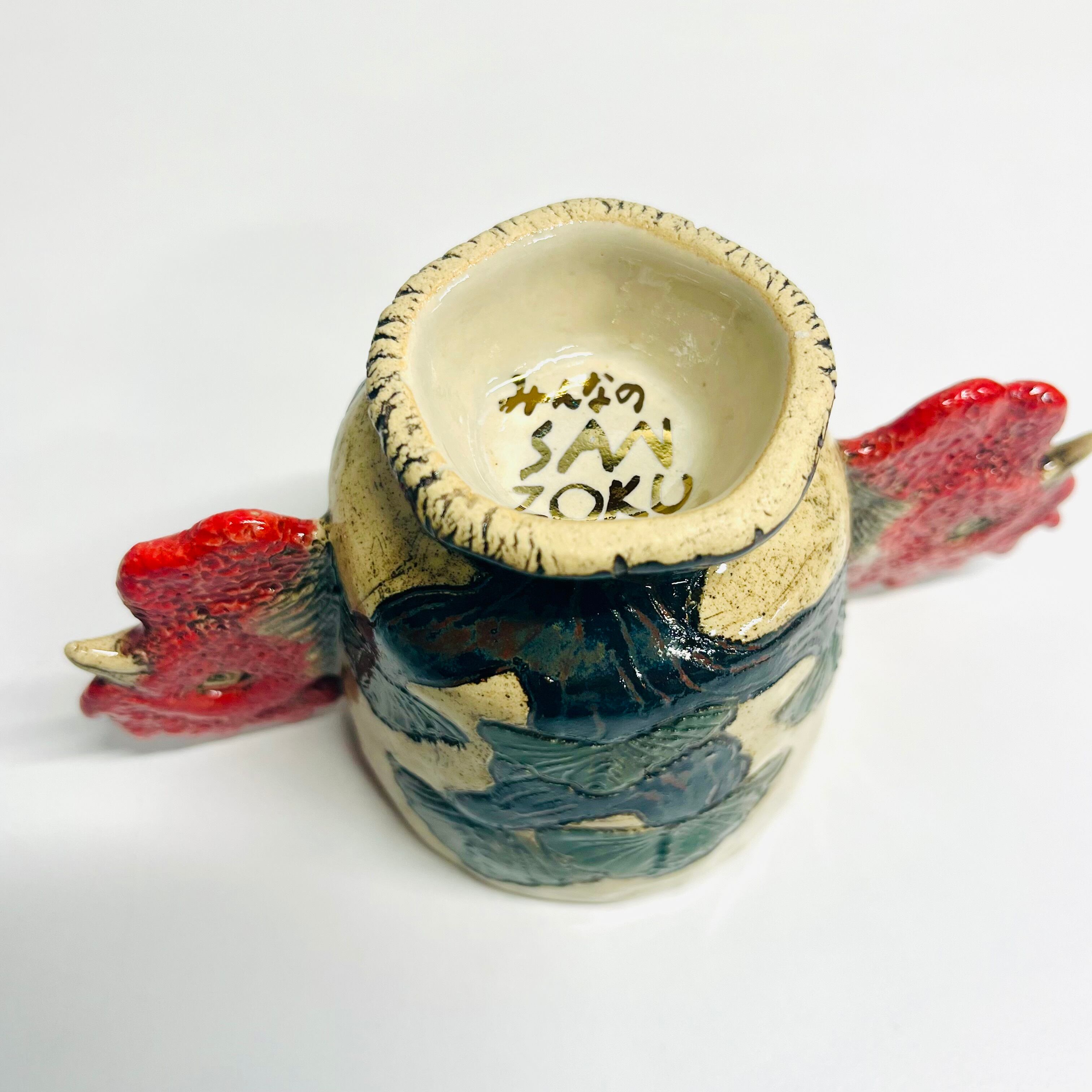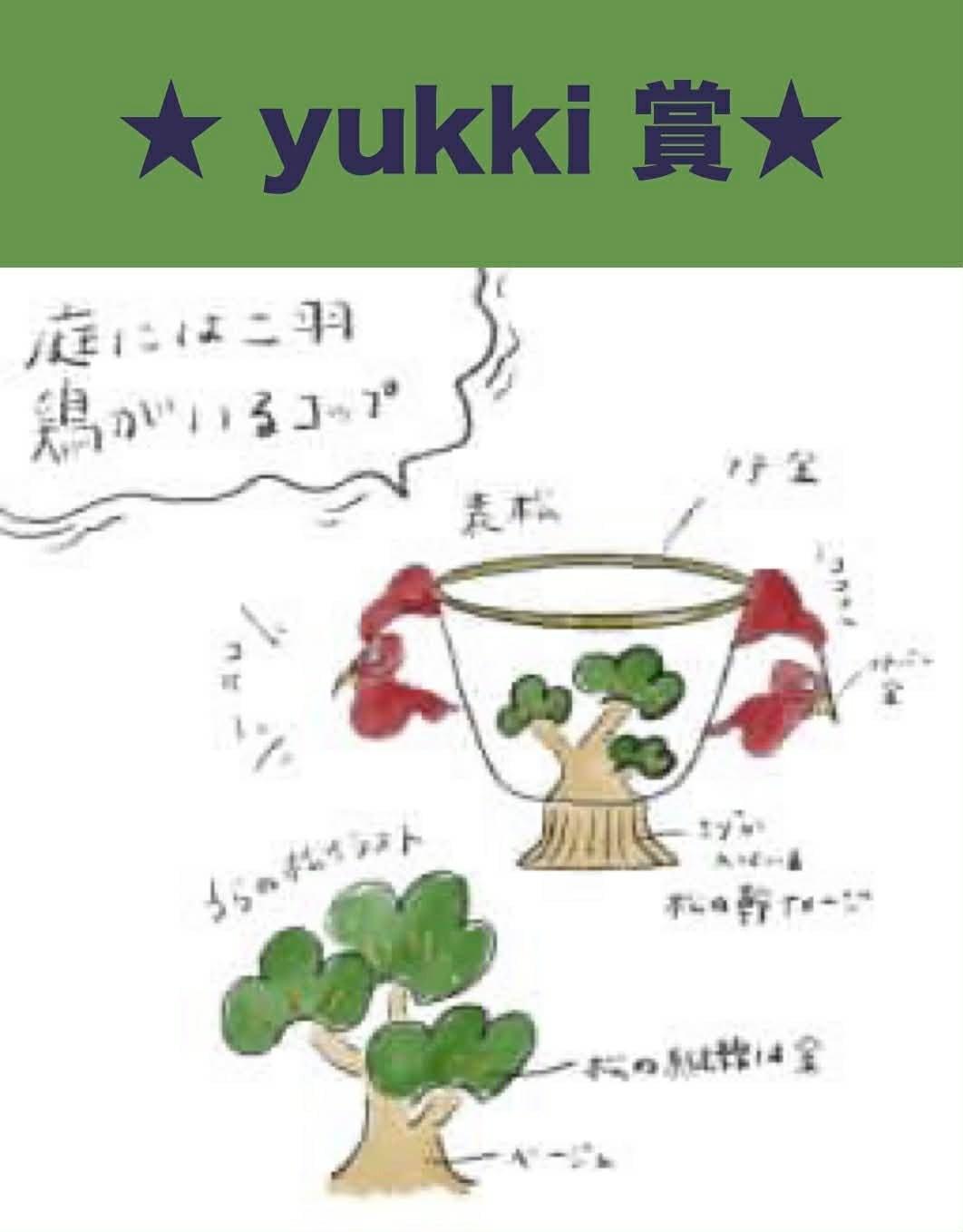 言葉遊びを視覚化したデザインに、SANZOKU賞の「スイカのイカの部分」に通じる面白さを感じました。「双耳」と呼ばれる二つの持ち手がある伝統的なデザインを、鶏の頭部に見立てることで、古典的な様式と遊び心が見事に融合しています。また、松(不老長寿)と鶏(明けの鳥)という縁起の良い組み合わせも吉祥性が高く、多くの人に喜ばれるデザインになっています。(yukki)
