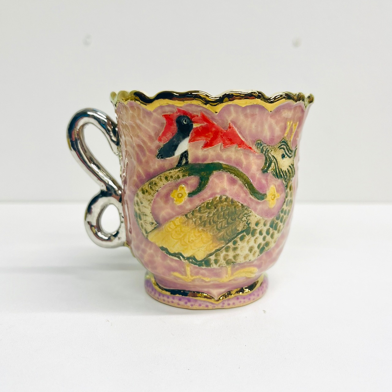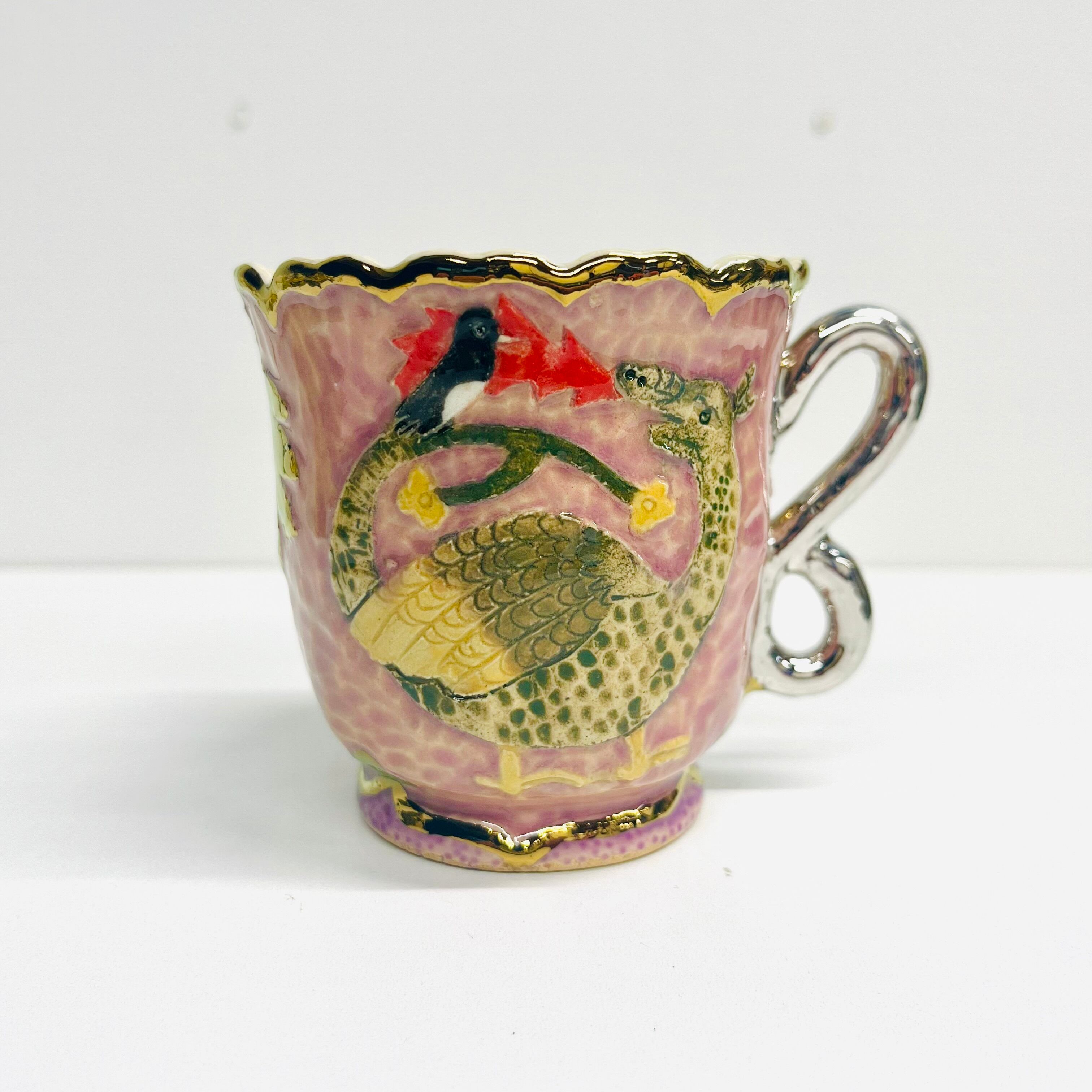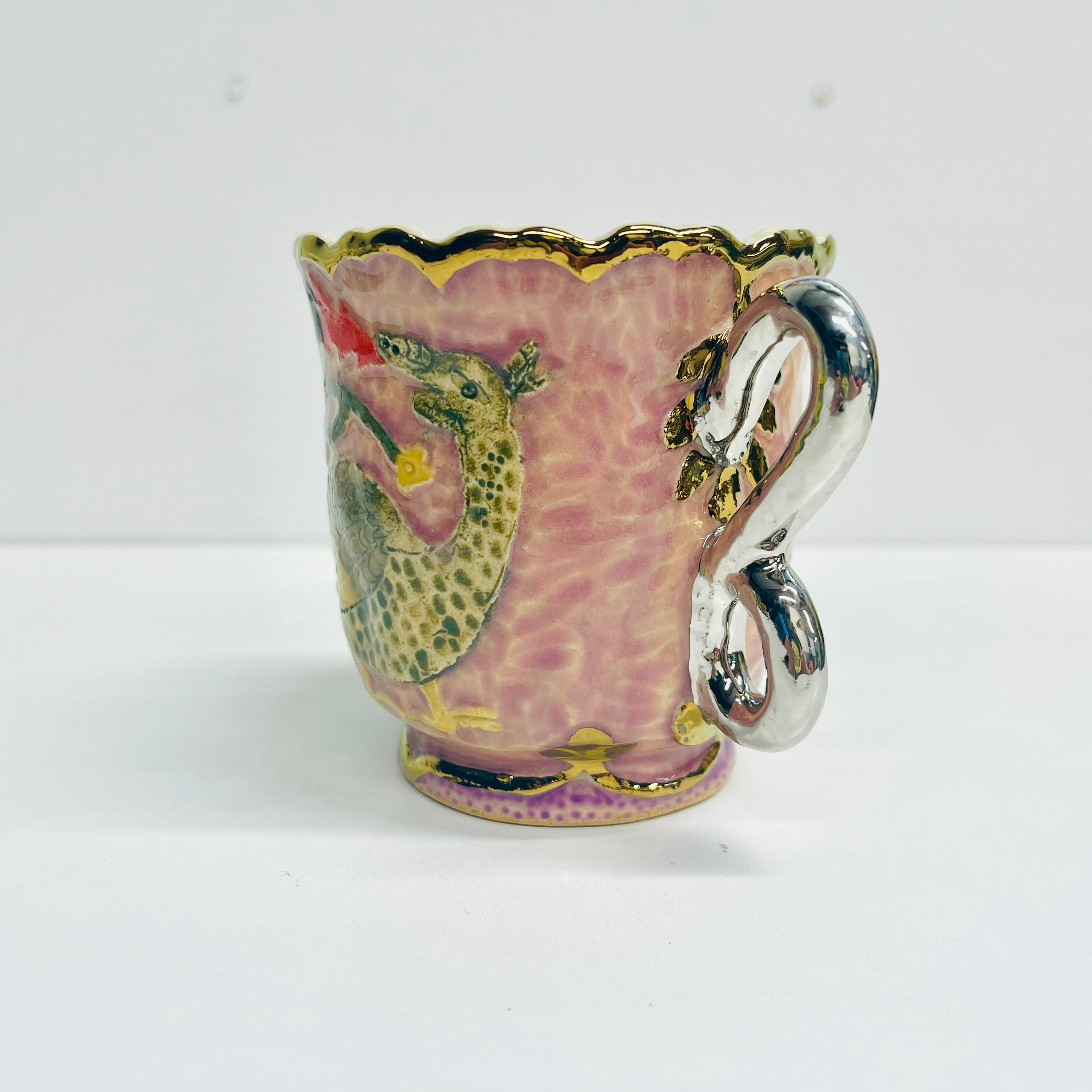 釉薬の影響により貫入(陶磁器の釉薬にできる細かいひび模様)が見られることがありますが、時間と共にますます魅力が増すことでしょう。金や銀の部分も焼き付けられているため、長期間使用することで薄くなることがありますが、その変化を楽しんでいただけますと幸いです。