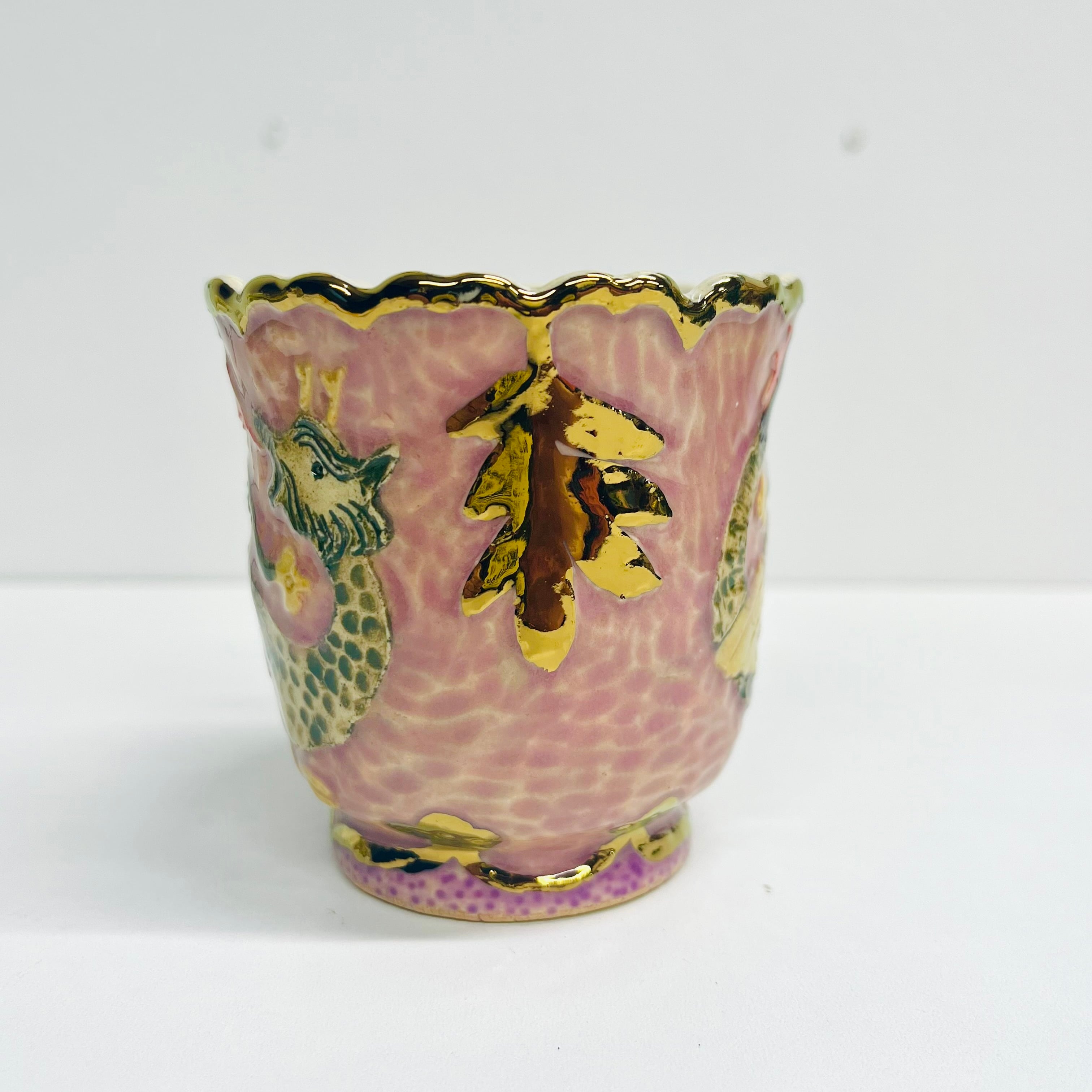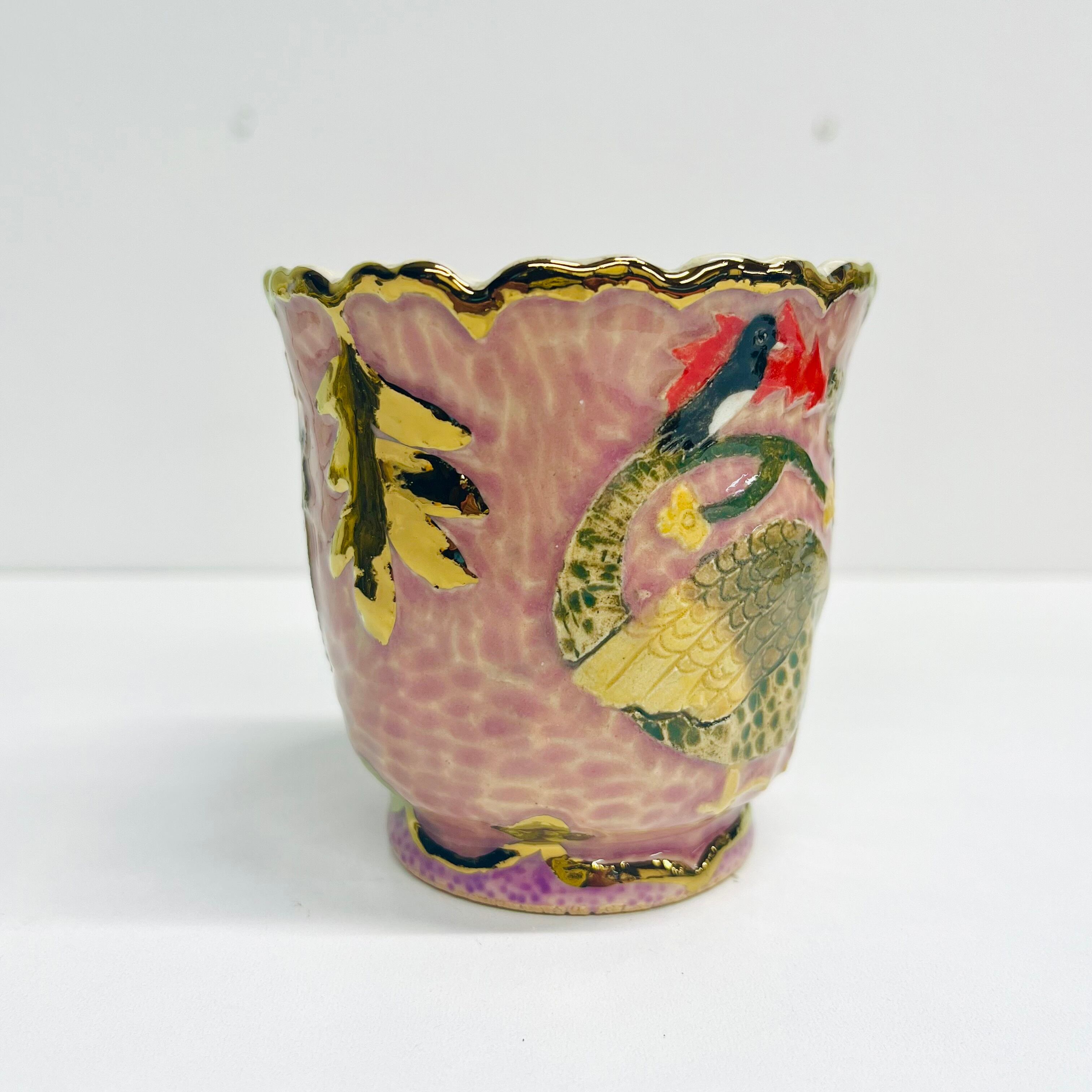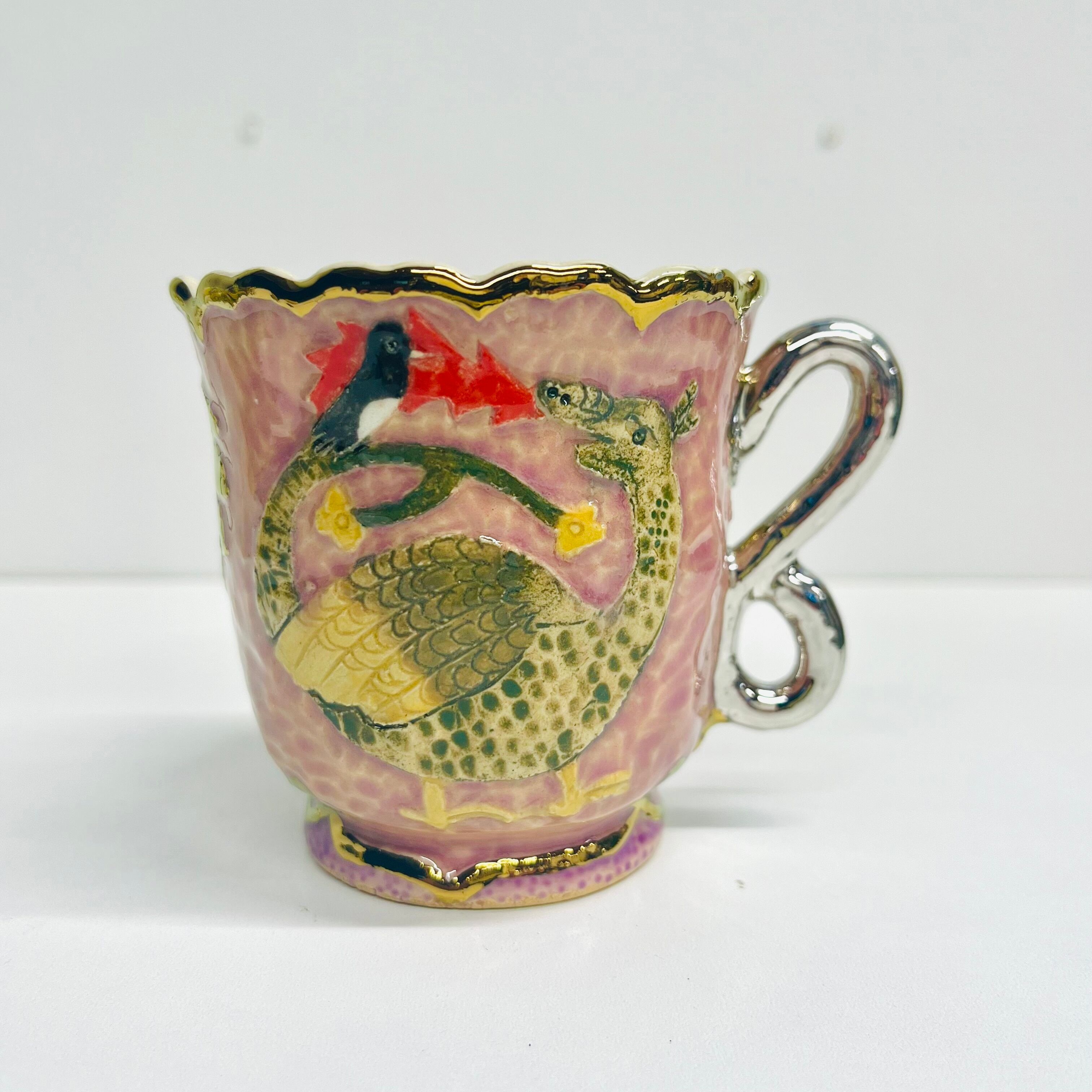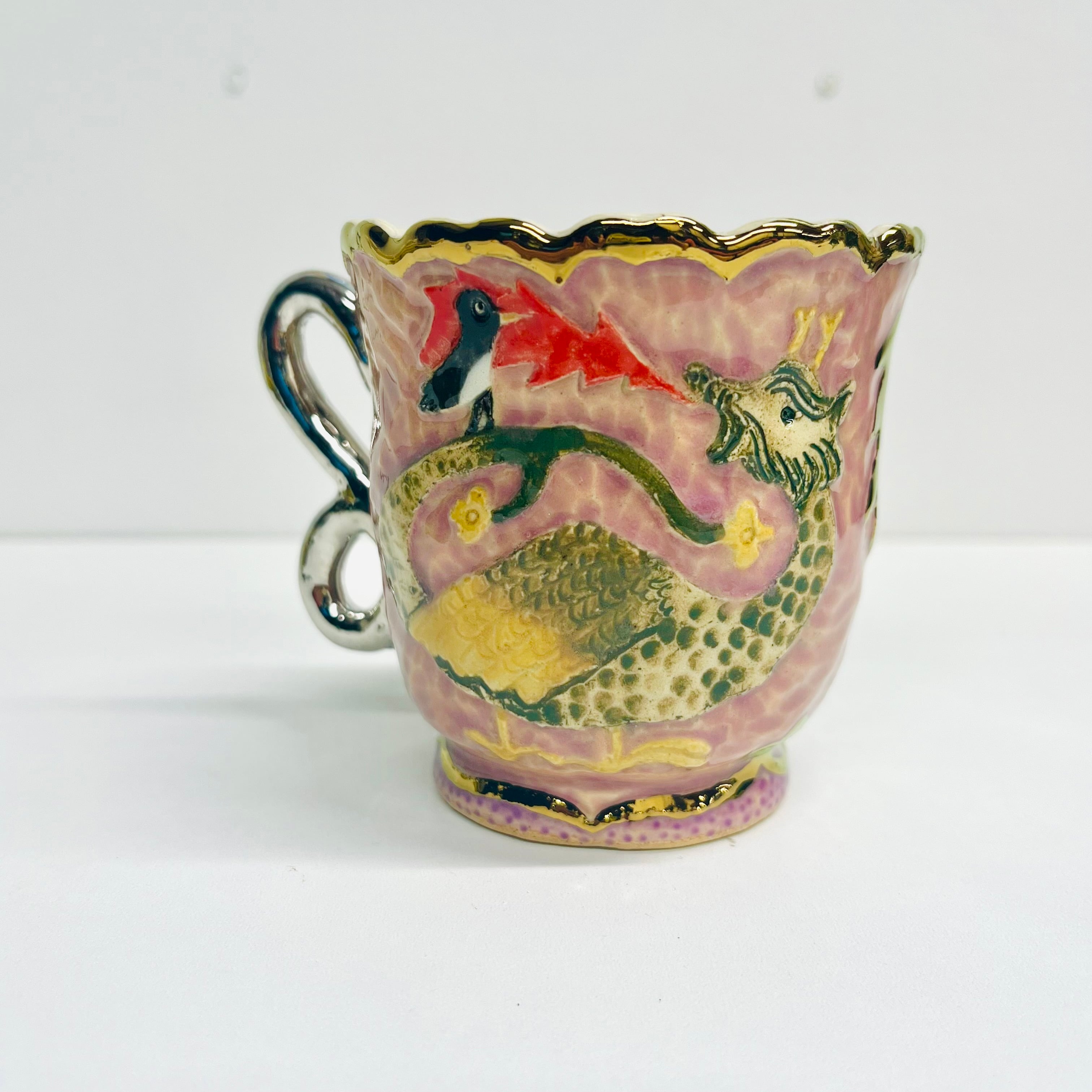 釉薬の影響により貫入(陶磁器の釉薬にできる細かいひび模様)が見られることがありますが、時間と共にますます魅力が増すことでしょう。金や銀の部分も焼き付けられているため、長期間使用することで薄くなることがありますが、その変化を楽しんでいただけますと幸いです。