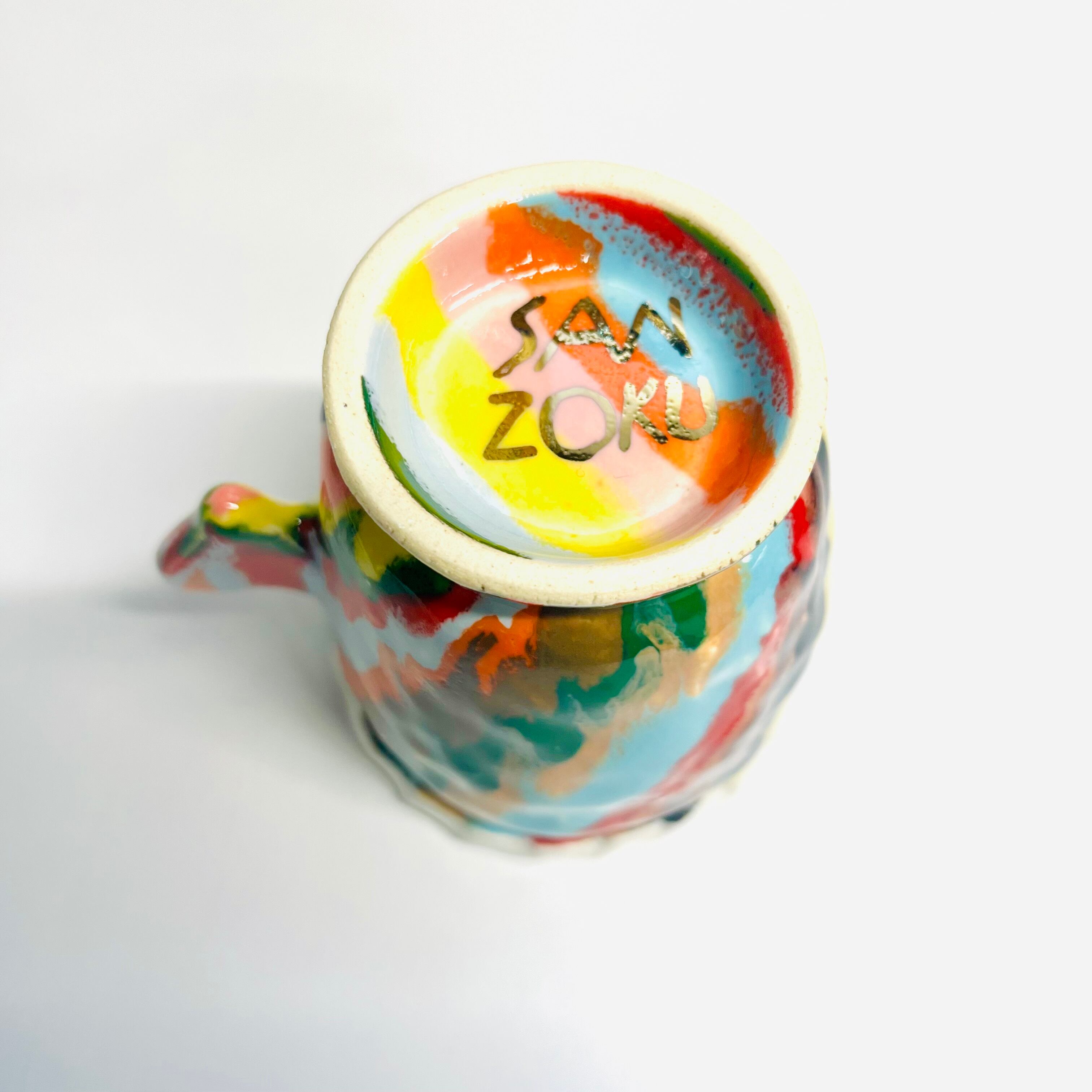 『sanzoku』は手びねりで作られている一点ものとなります。轆轤や、型などとの成形方法とは異なり手の指の力のみで土を圧縮して成形する為,