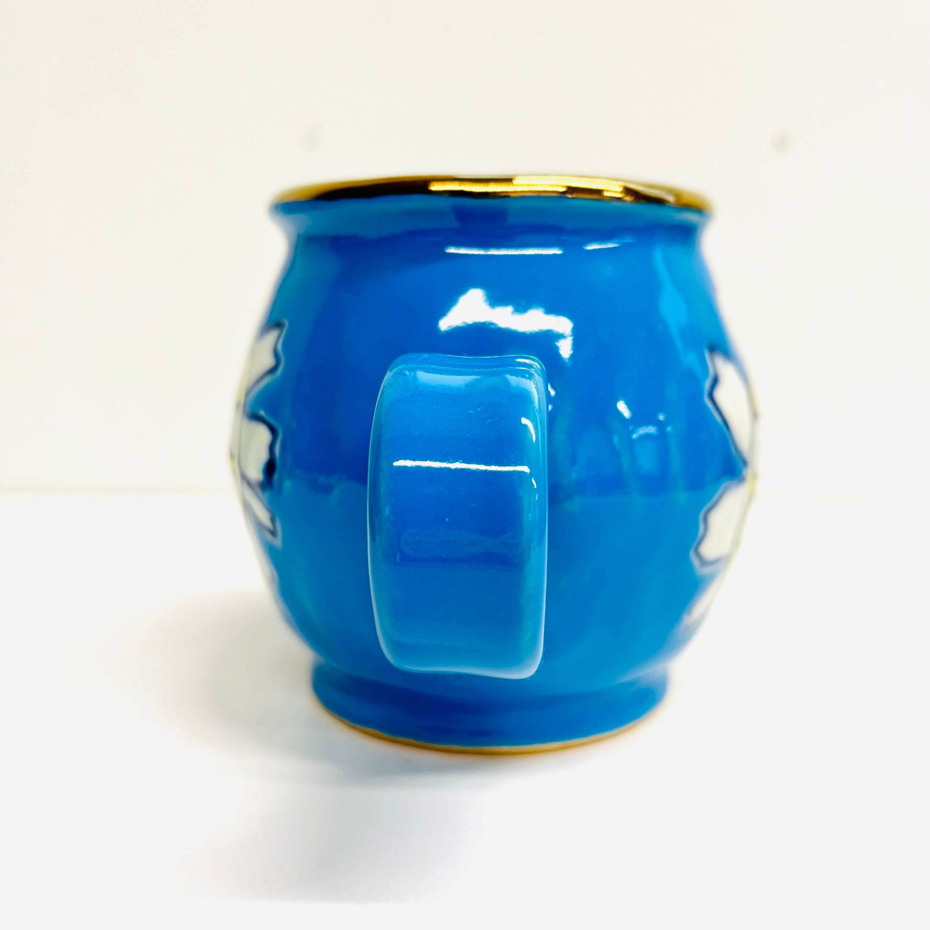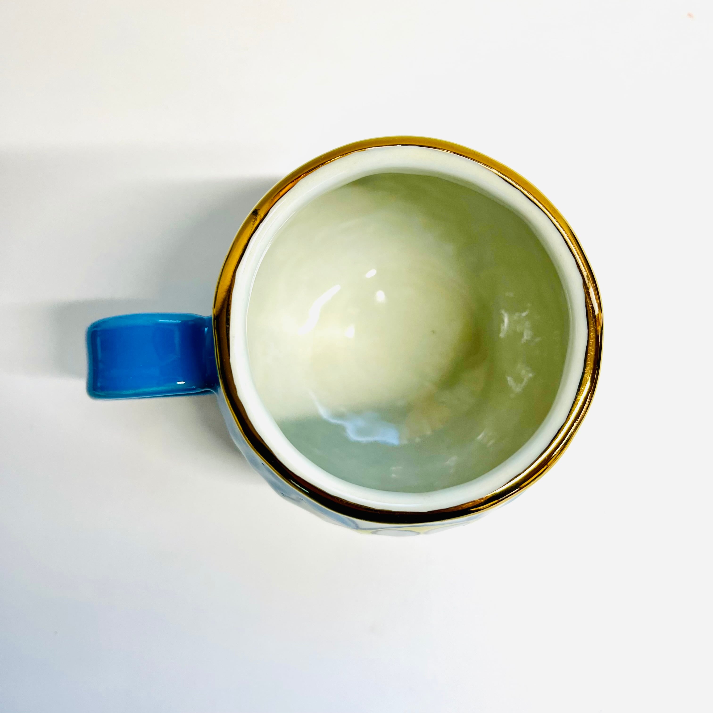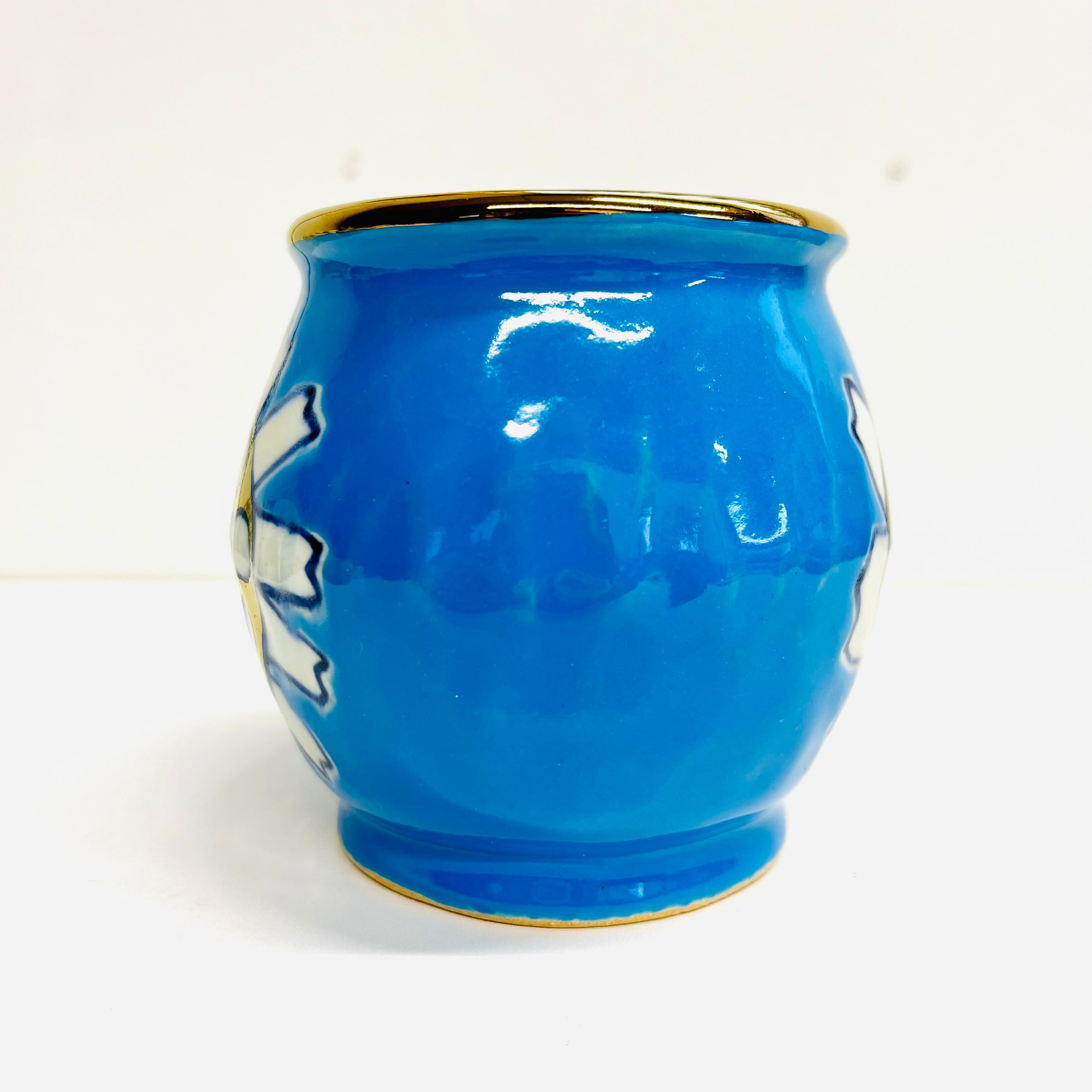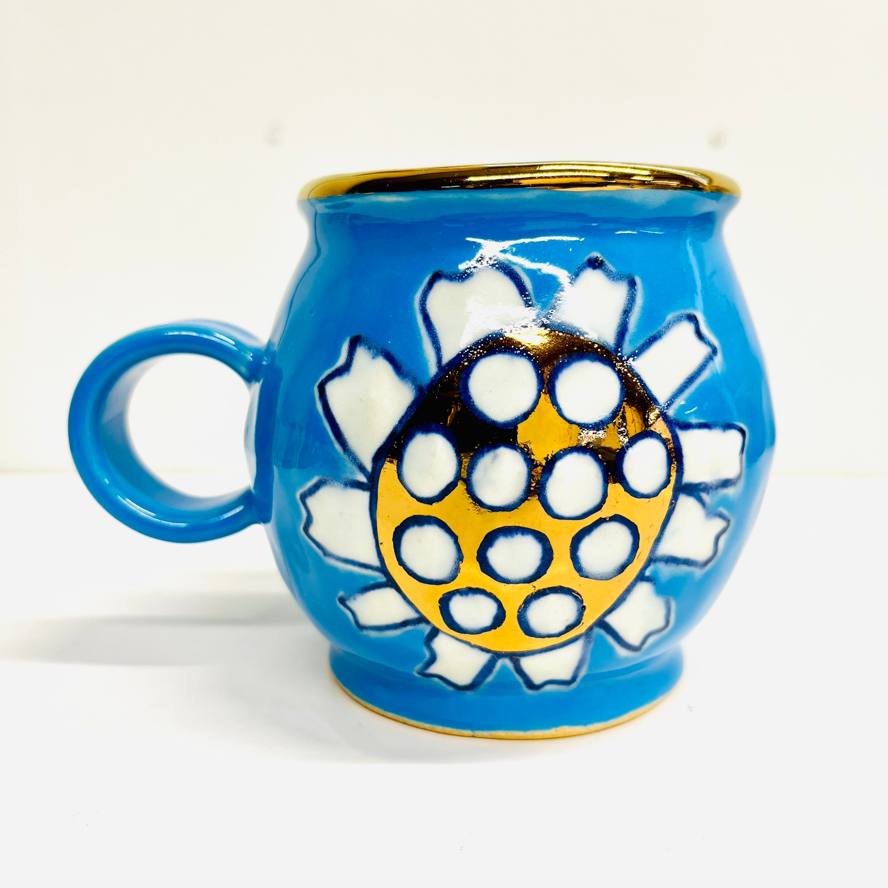 通常の花カップは小ぶりなサイズなので少し大きめです。ブルーの釉薬に可愛い花柄が光ります☆