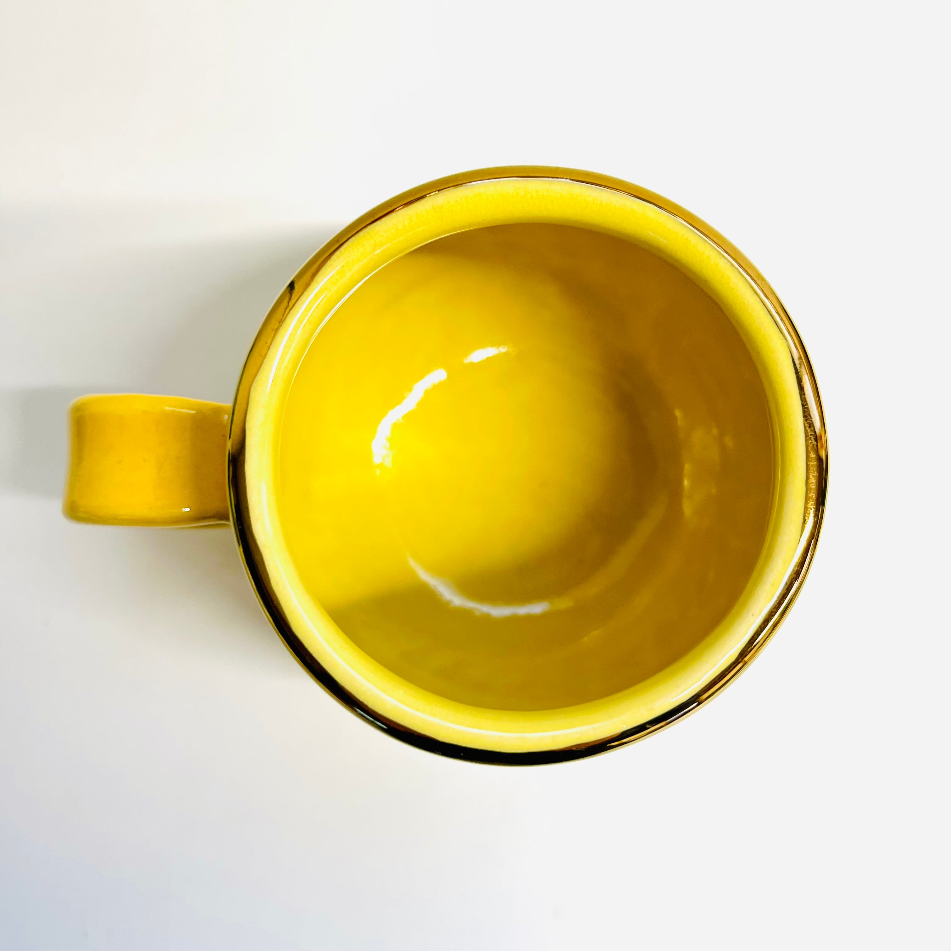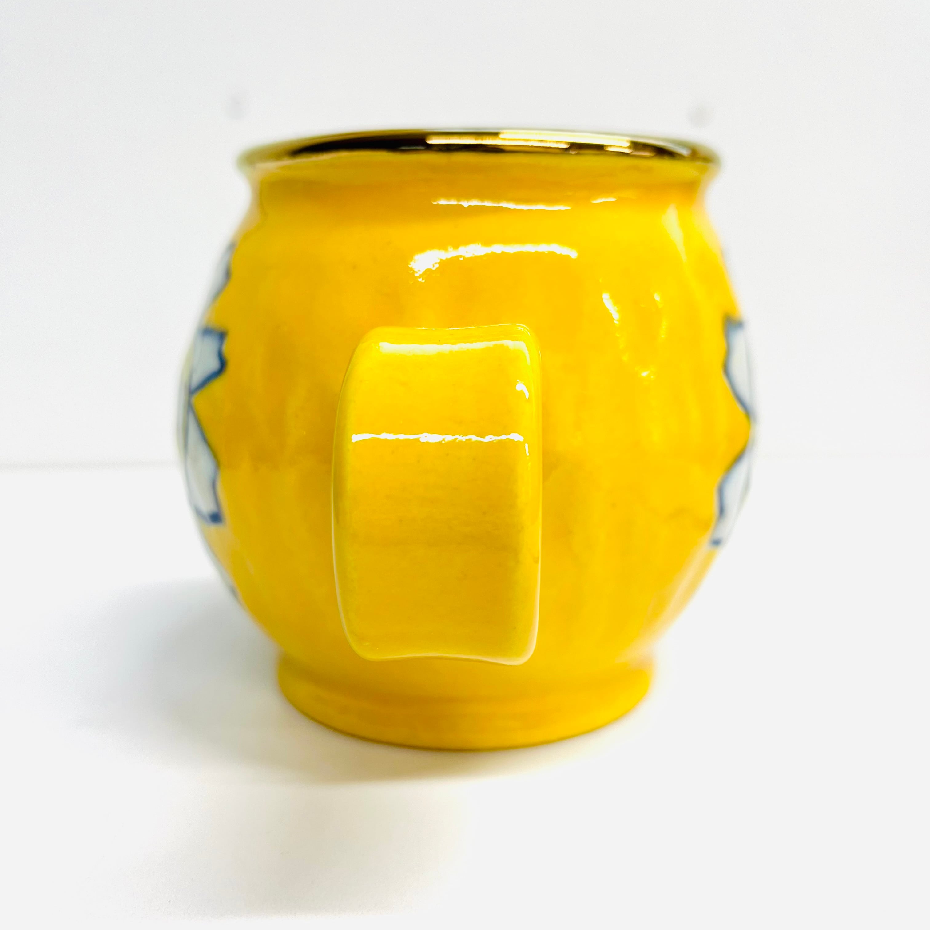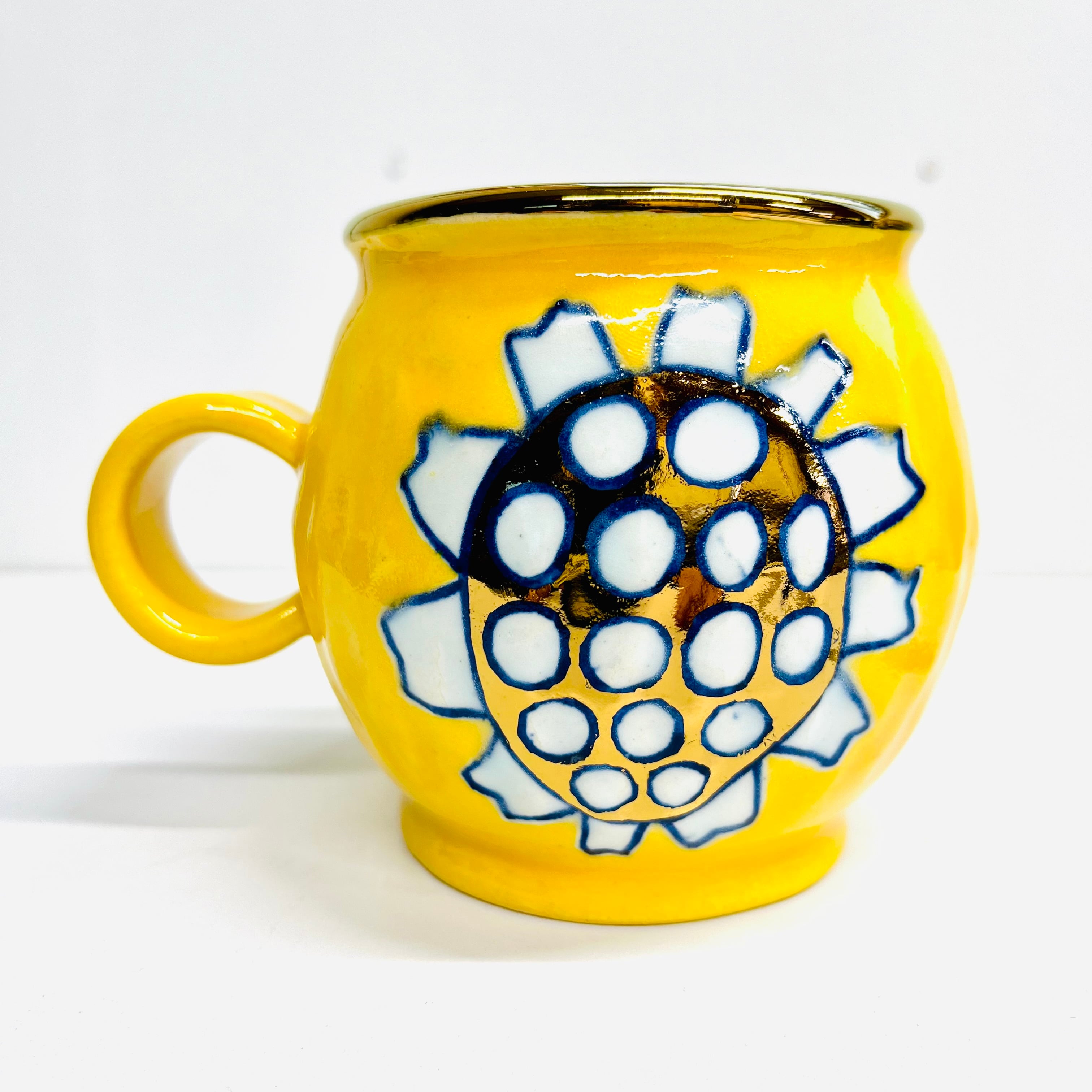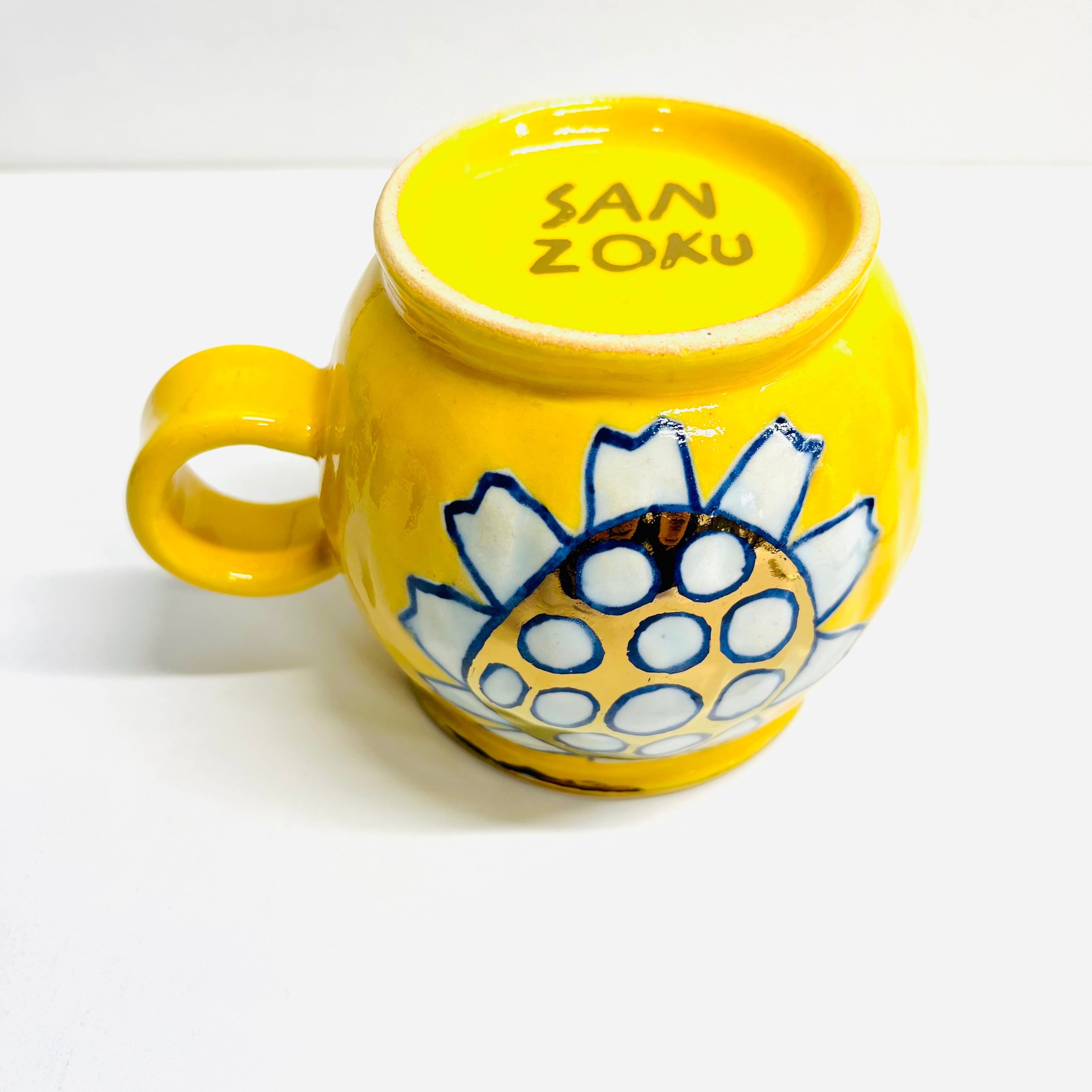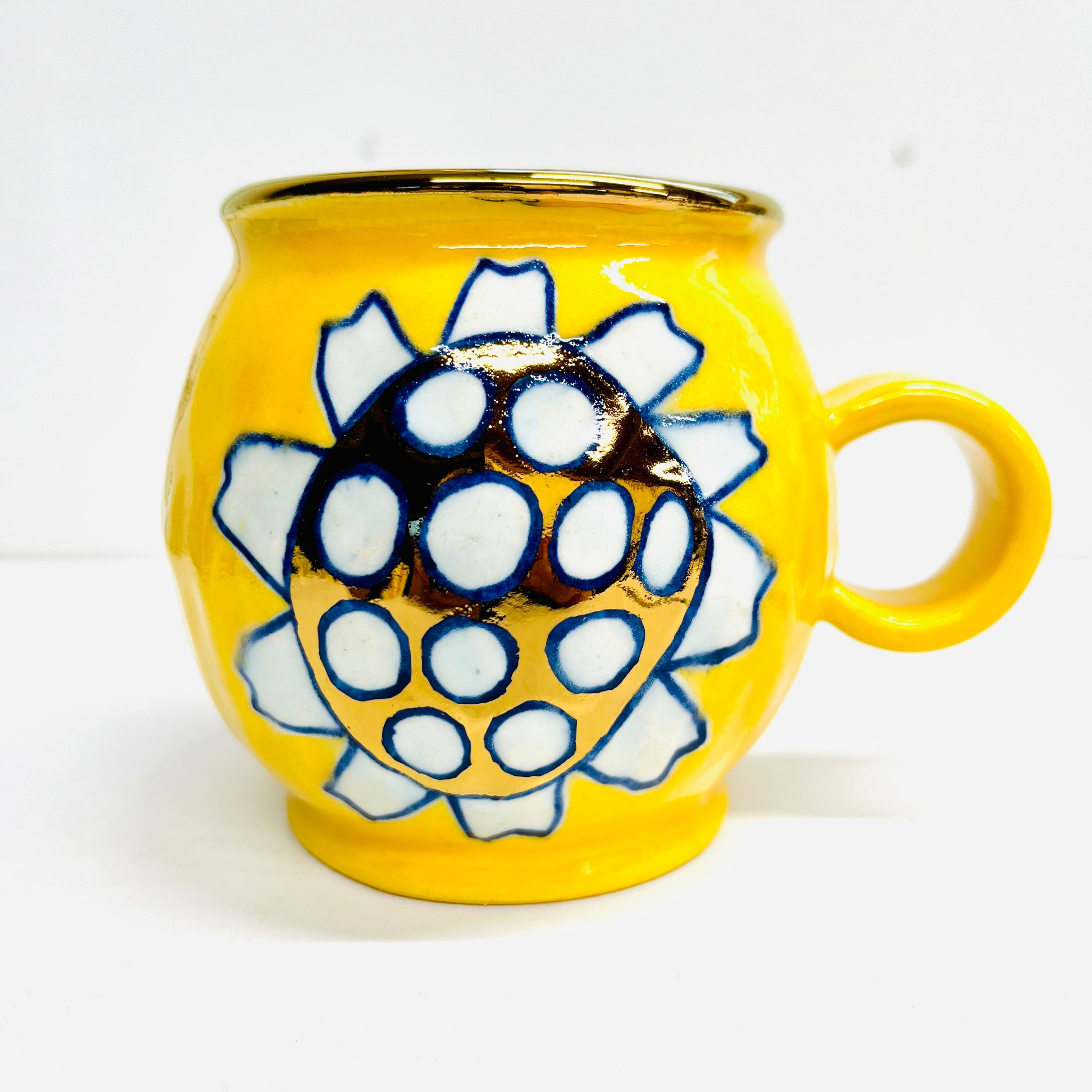 通常の花カップは小ぶりなサイズなので、こちらは少し大きめです。黄色の釉薬に可愛い花柄が光ります☆