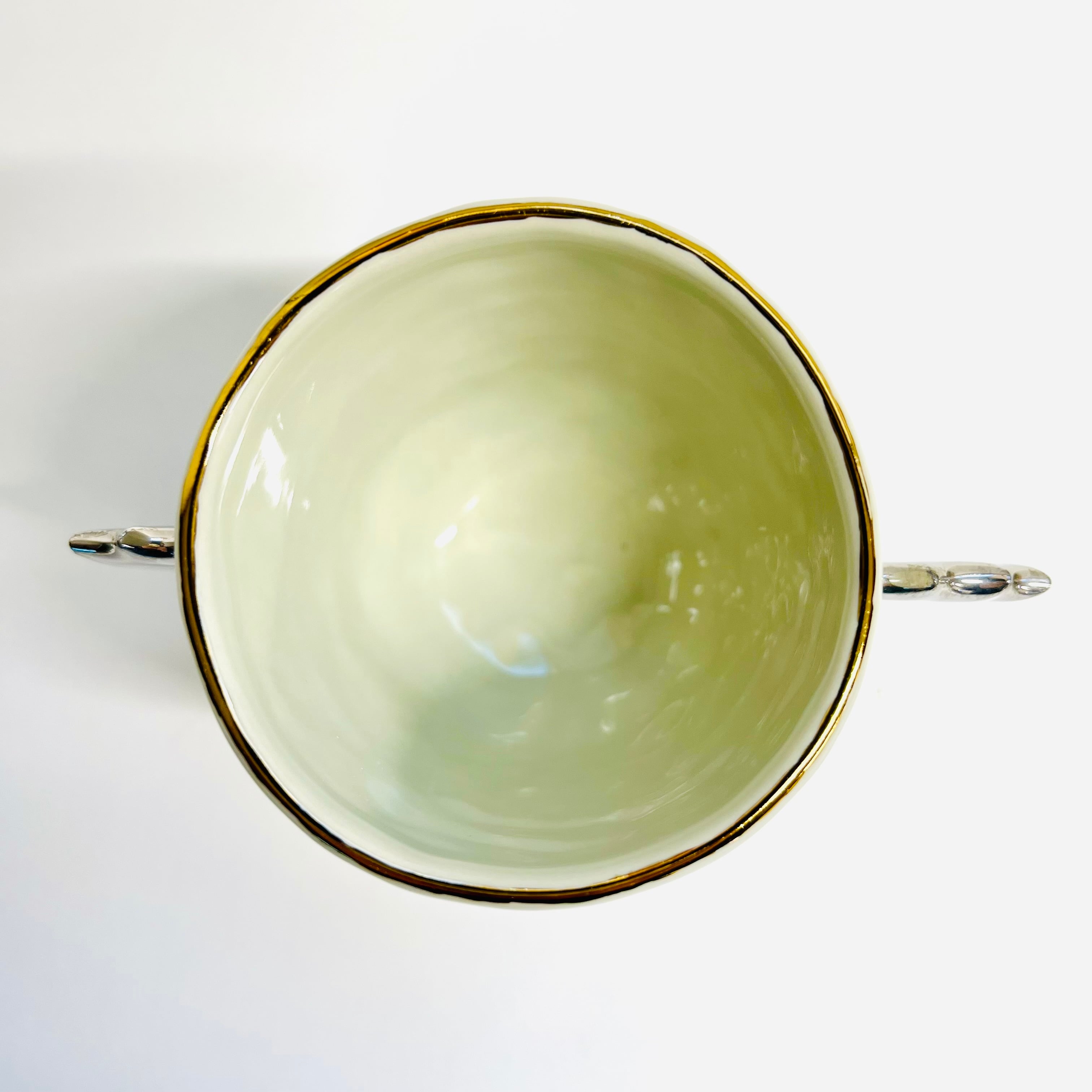 金や銀(金彩、銀彩)の部分に関しては、焼き付けてはおりますが、あくまで半永久の物になりますので、使用していると薄れてきたり色合いが変化したりします。また、固めのスポンジ等でで擦るととれてしまう事があります。時間の経過の雰囲気、味としてご理解頂けます様お願い致します。金彩の金の含有率は6%のものを使用しています。