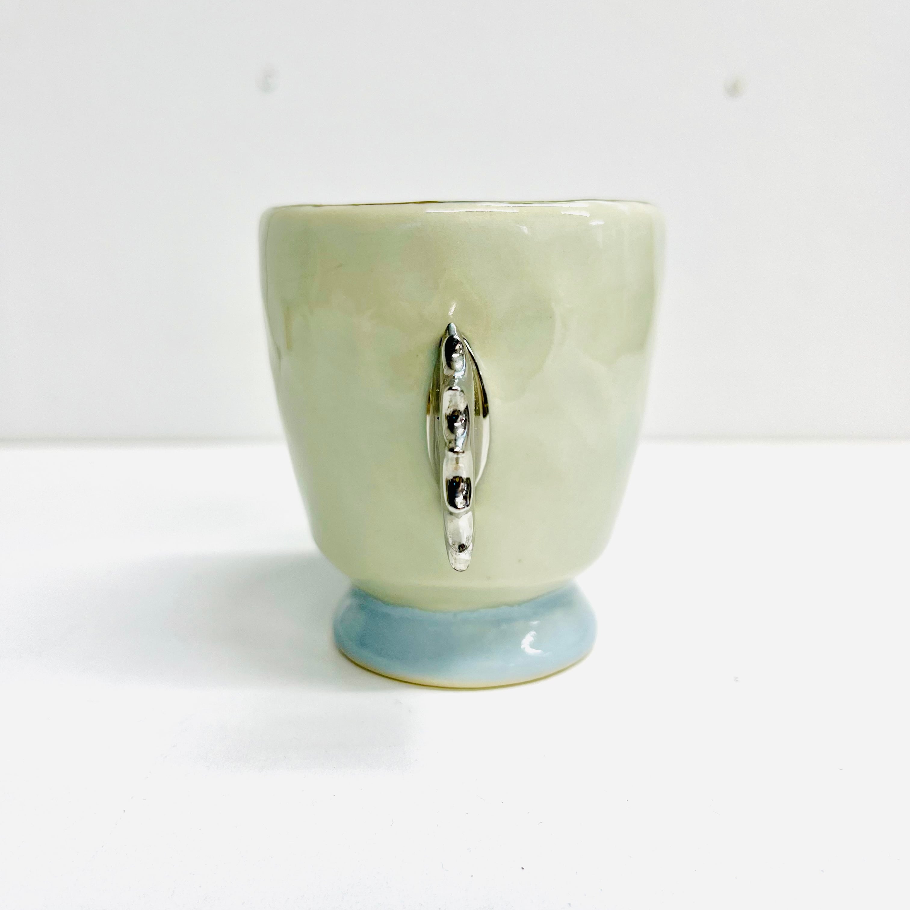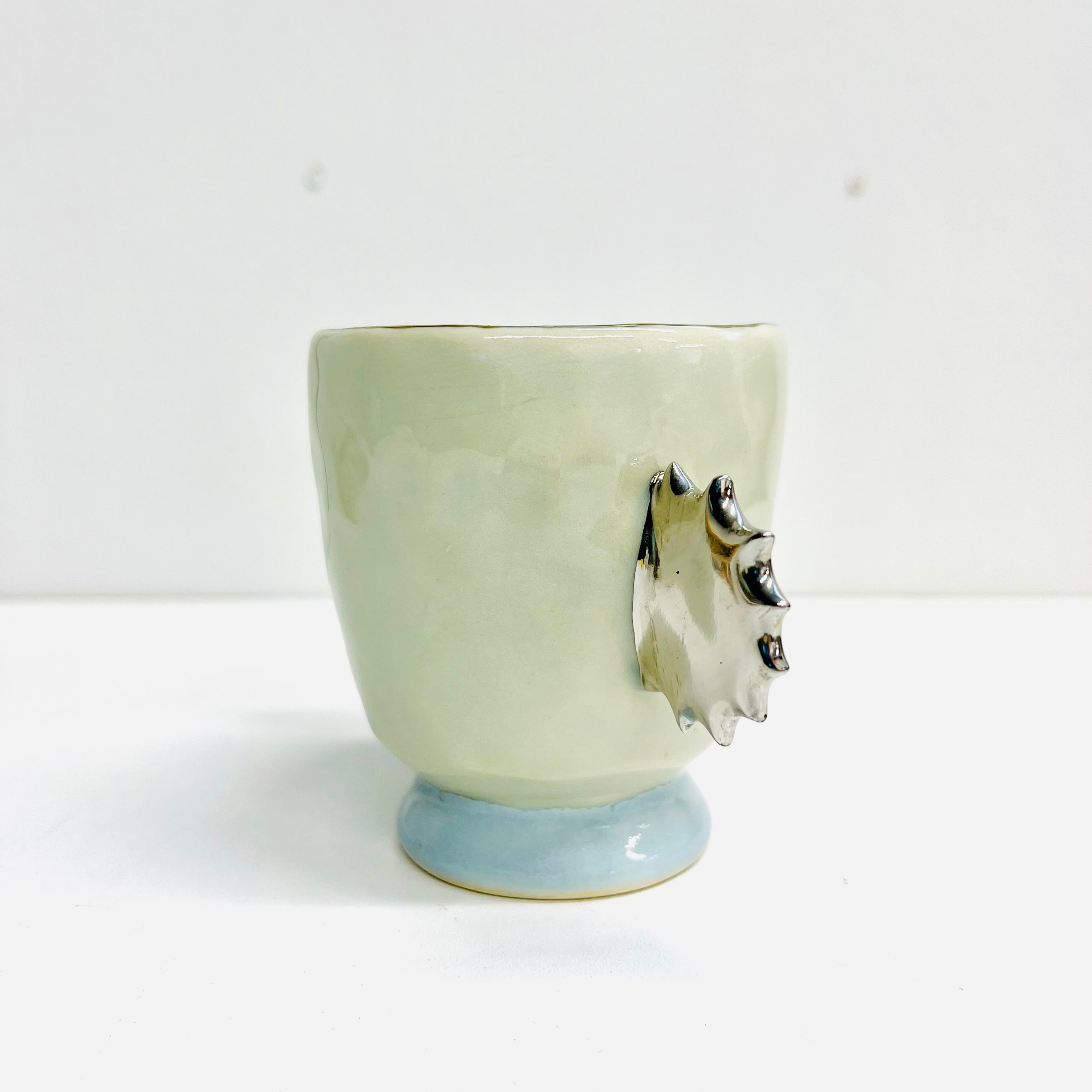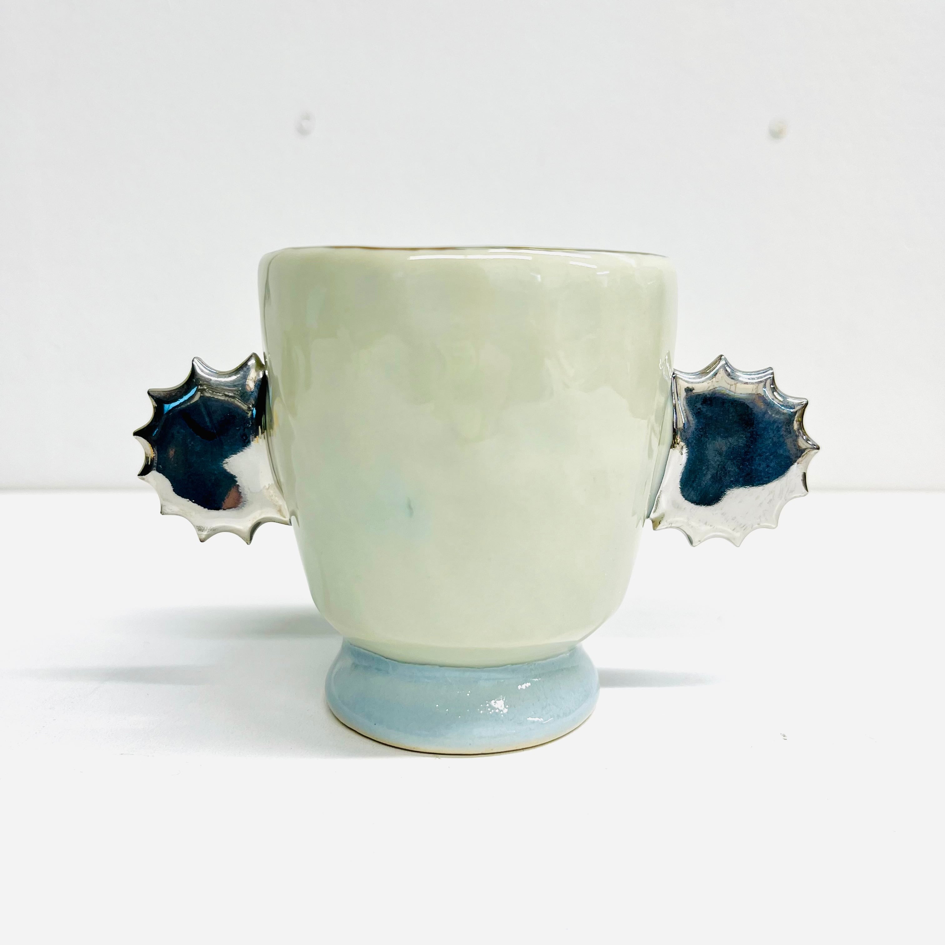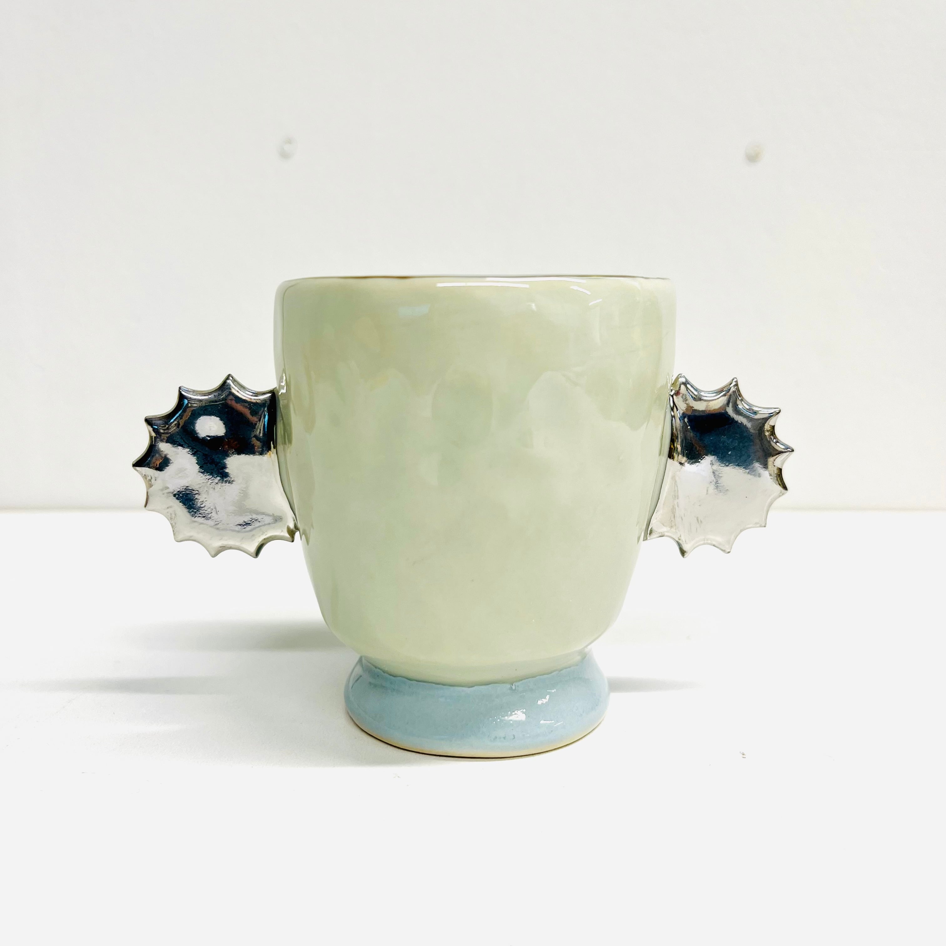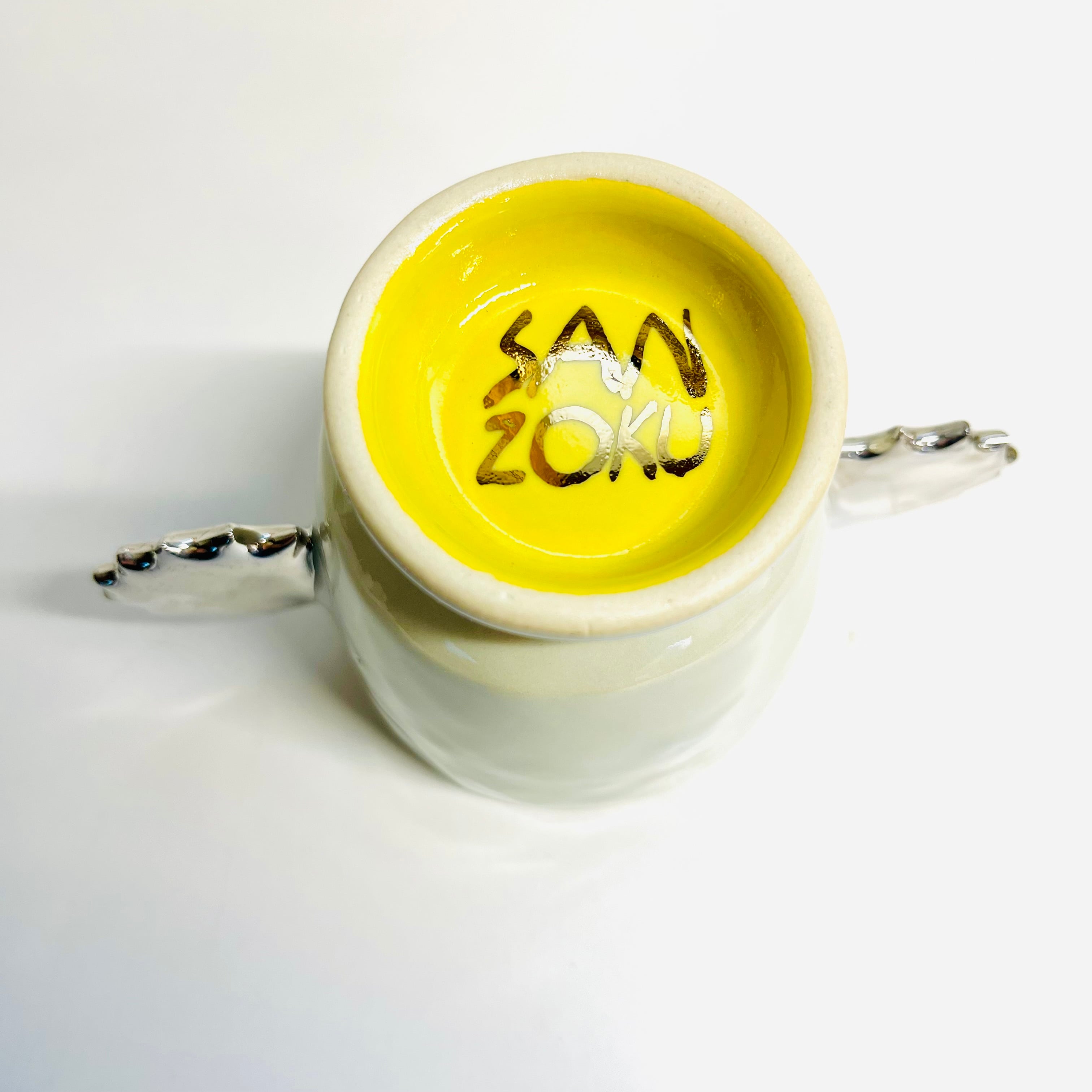 両サイドに付いた星がシルバーで輝いています。両手を開いてエールを送っています。使い込むほどにシルバーの星や釉薬が味わい深くなります。