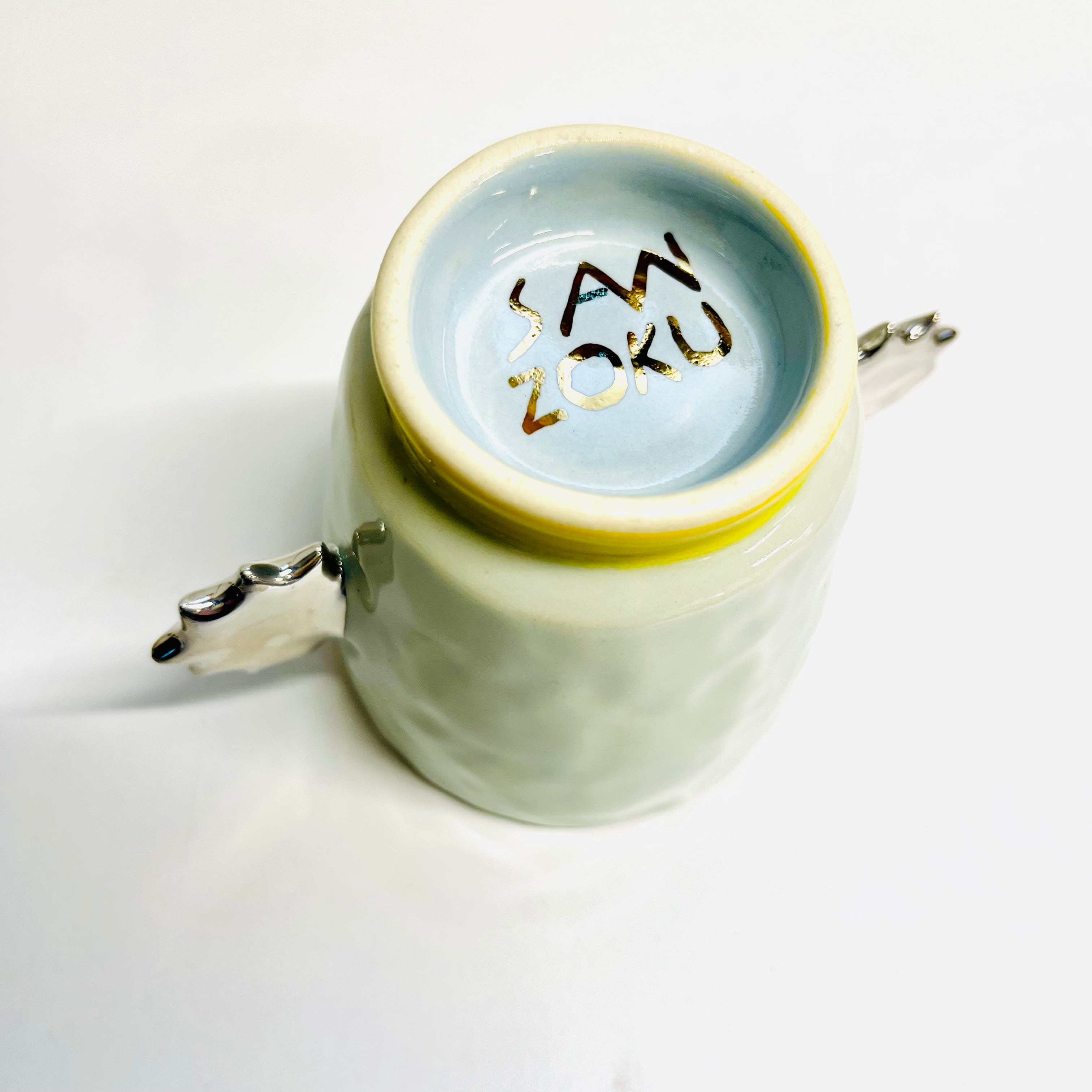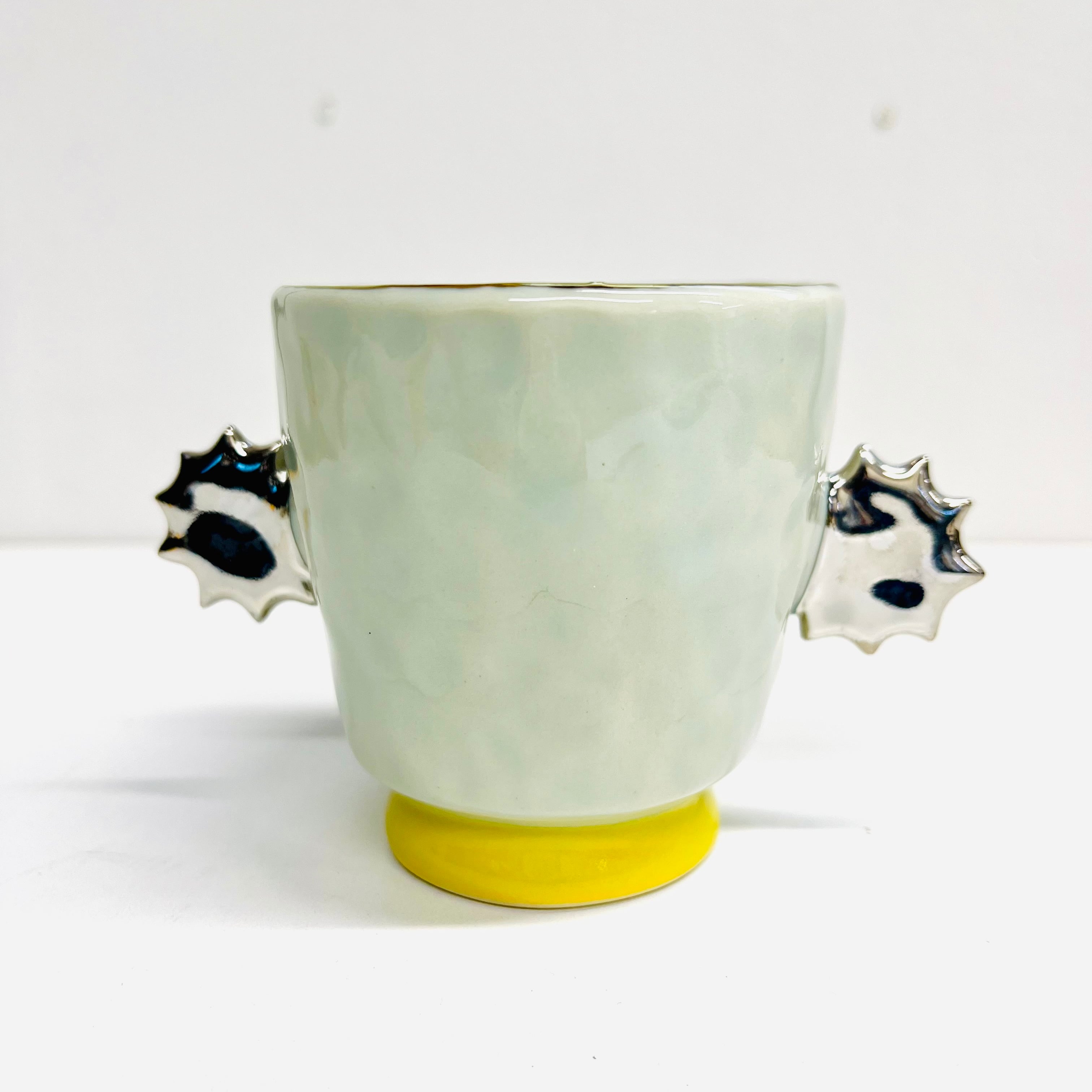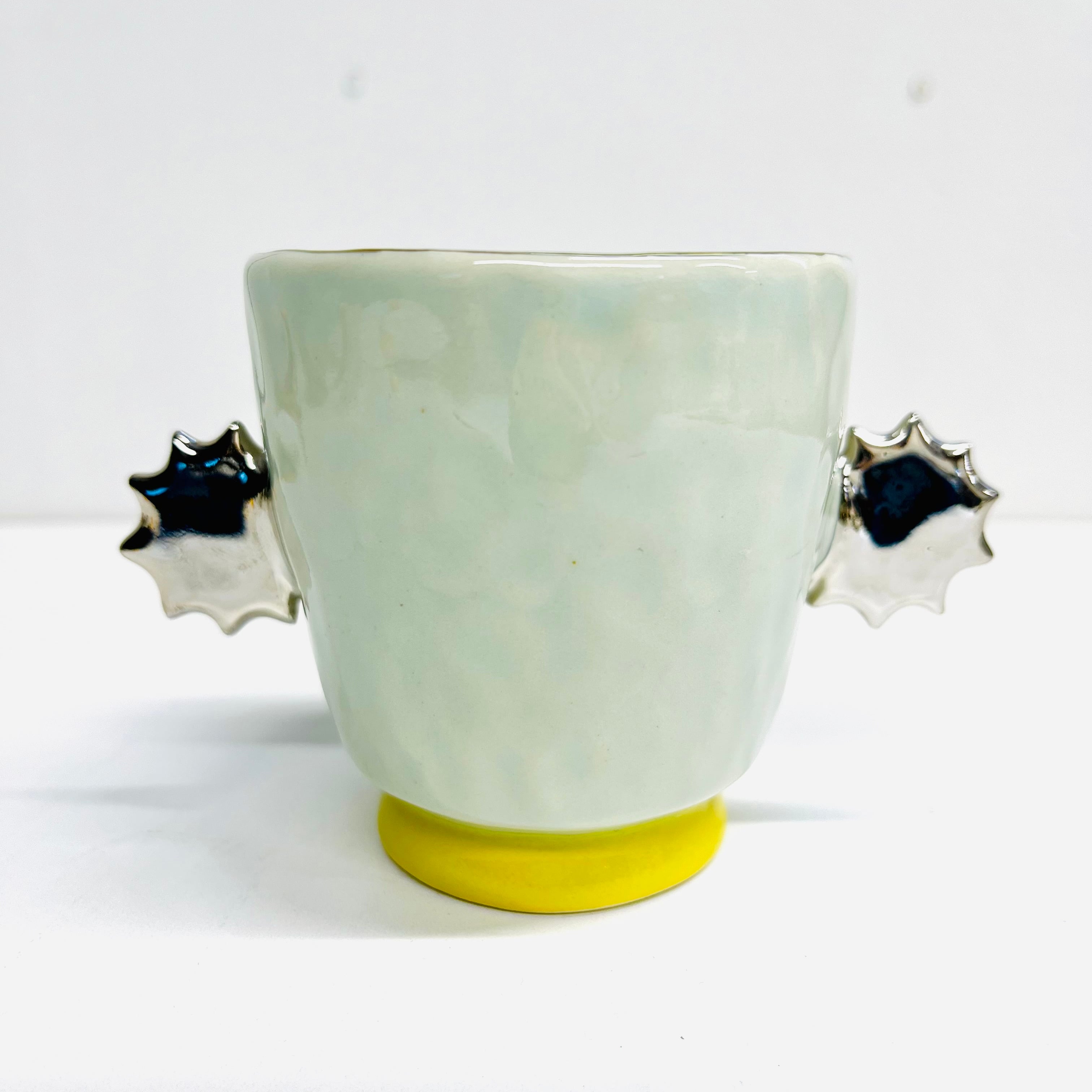 両サイドに付いた星がシルバーで輝いています。両手を開いてエールを送っています。使い込むほどにシルバーの星や釉薬が味わい深くなります。