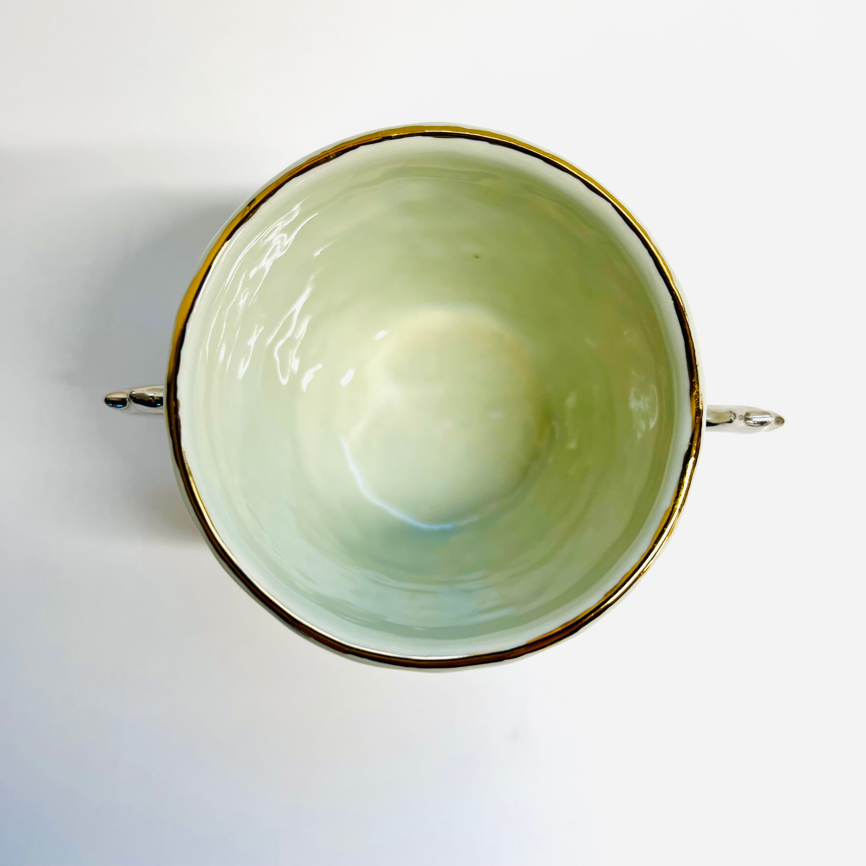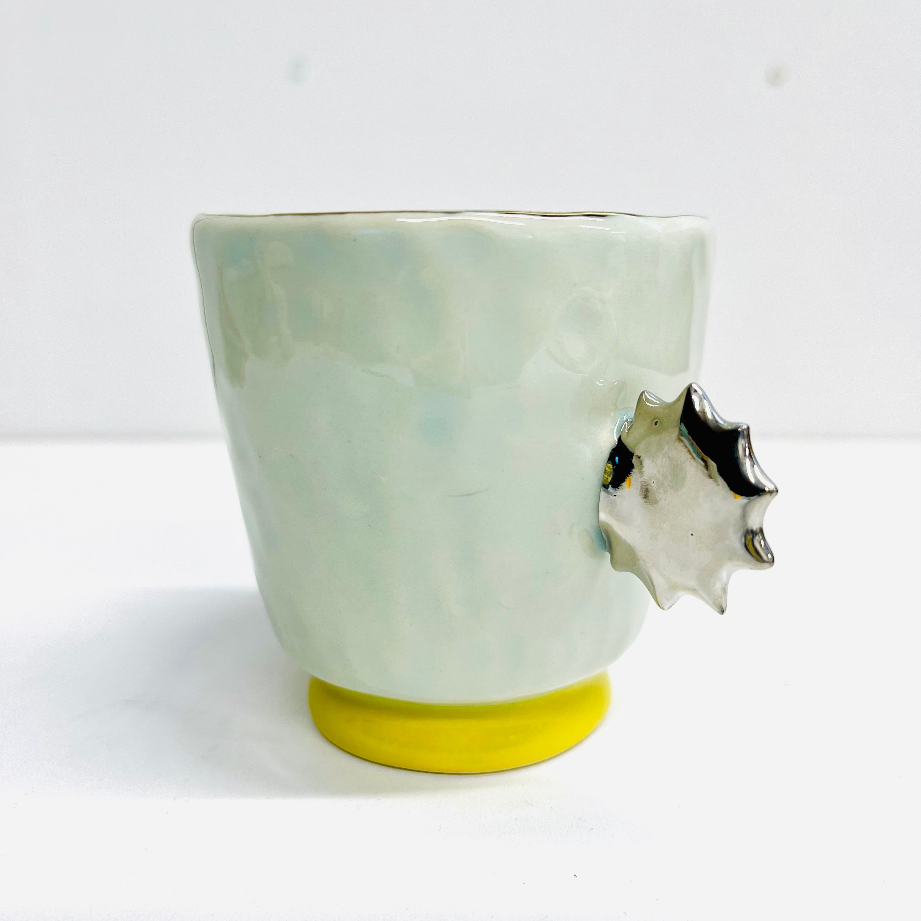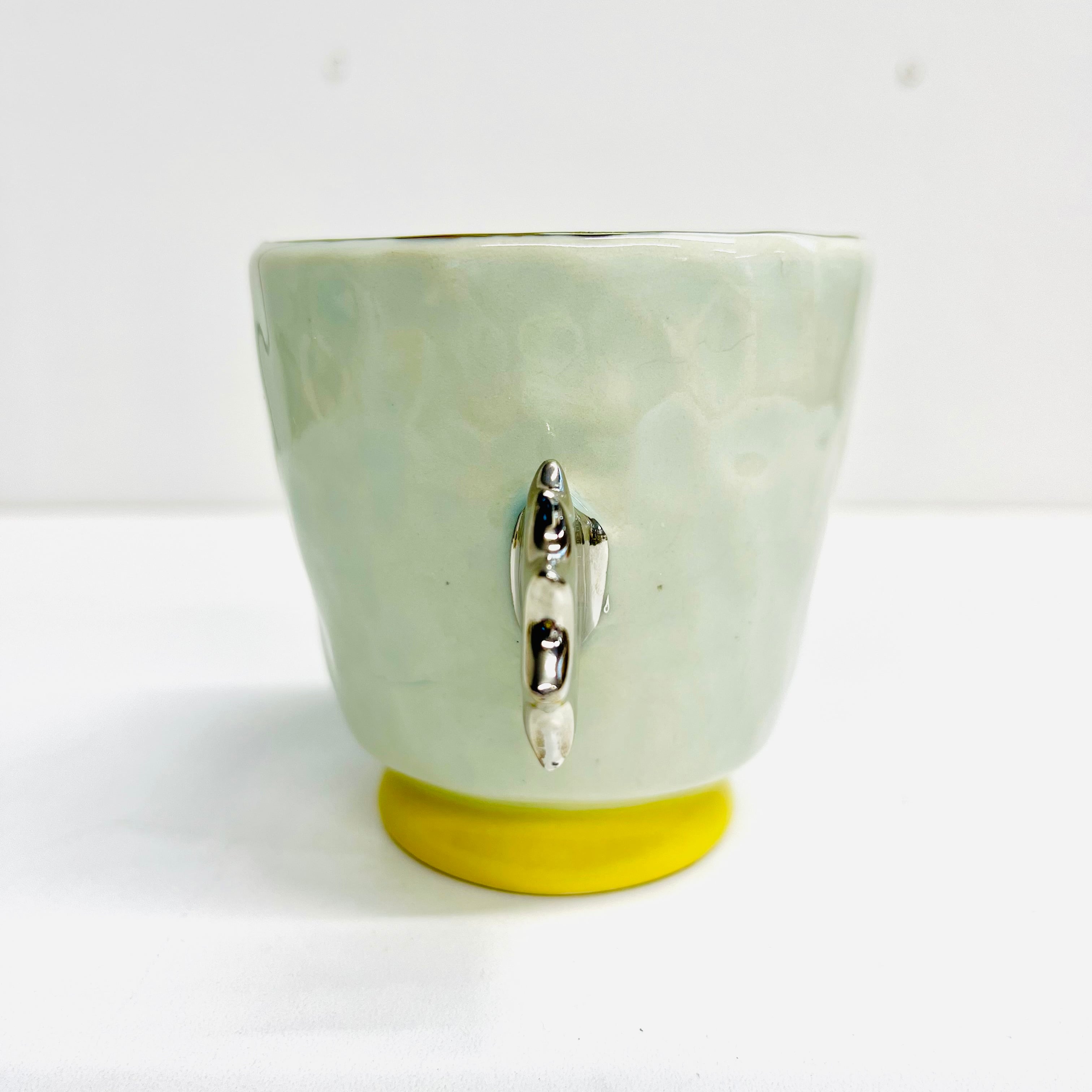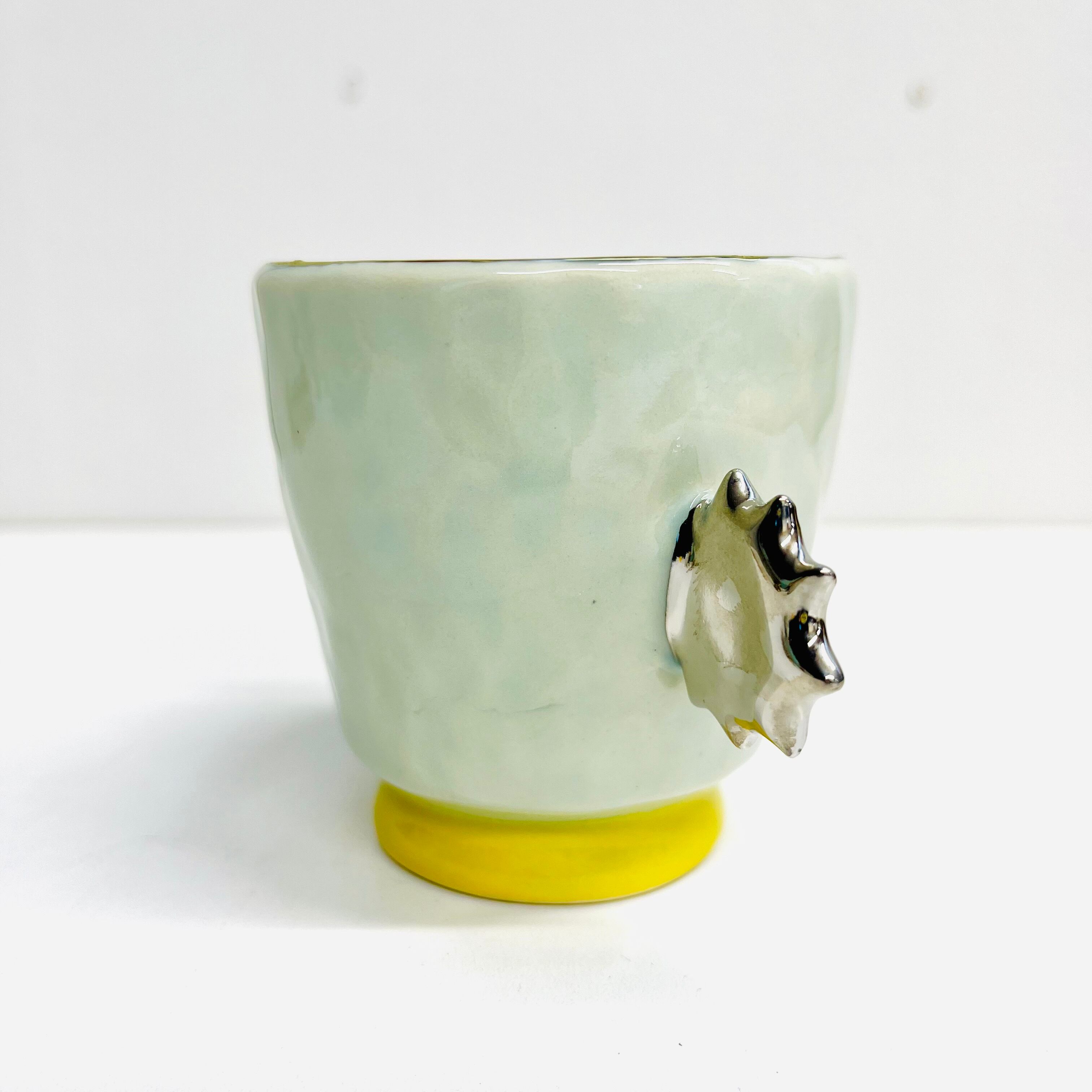 両サイドに付いた星がシルバーで輝いています。両手を開いてエールを送っています。使い込むほどにシルバーの星や釉薬が味わい深くなります。