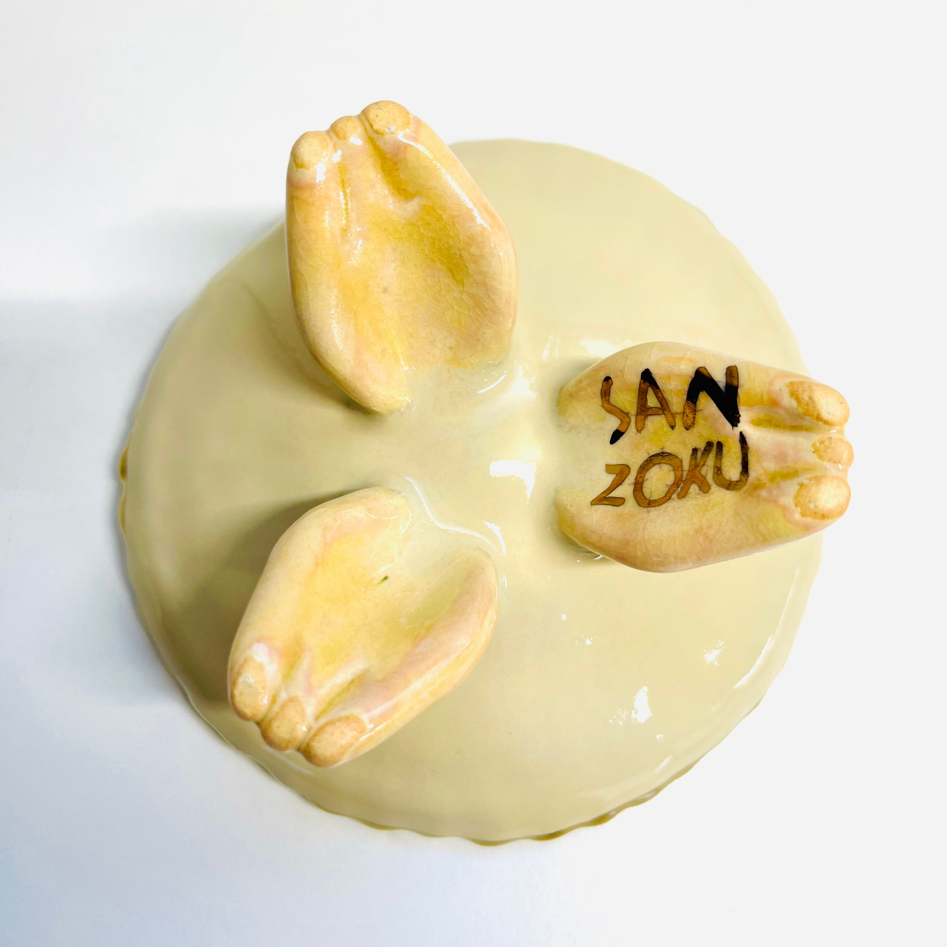 『sanzoku』は手びねりで作られている一点ものとなります。轆轤や、型などとの成形方法とは異なり手の指の力のみで土を圧縮して成形する為,