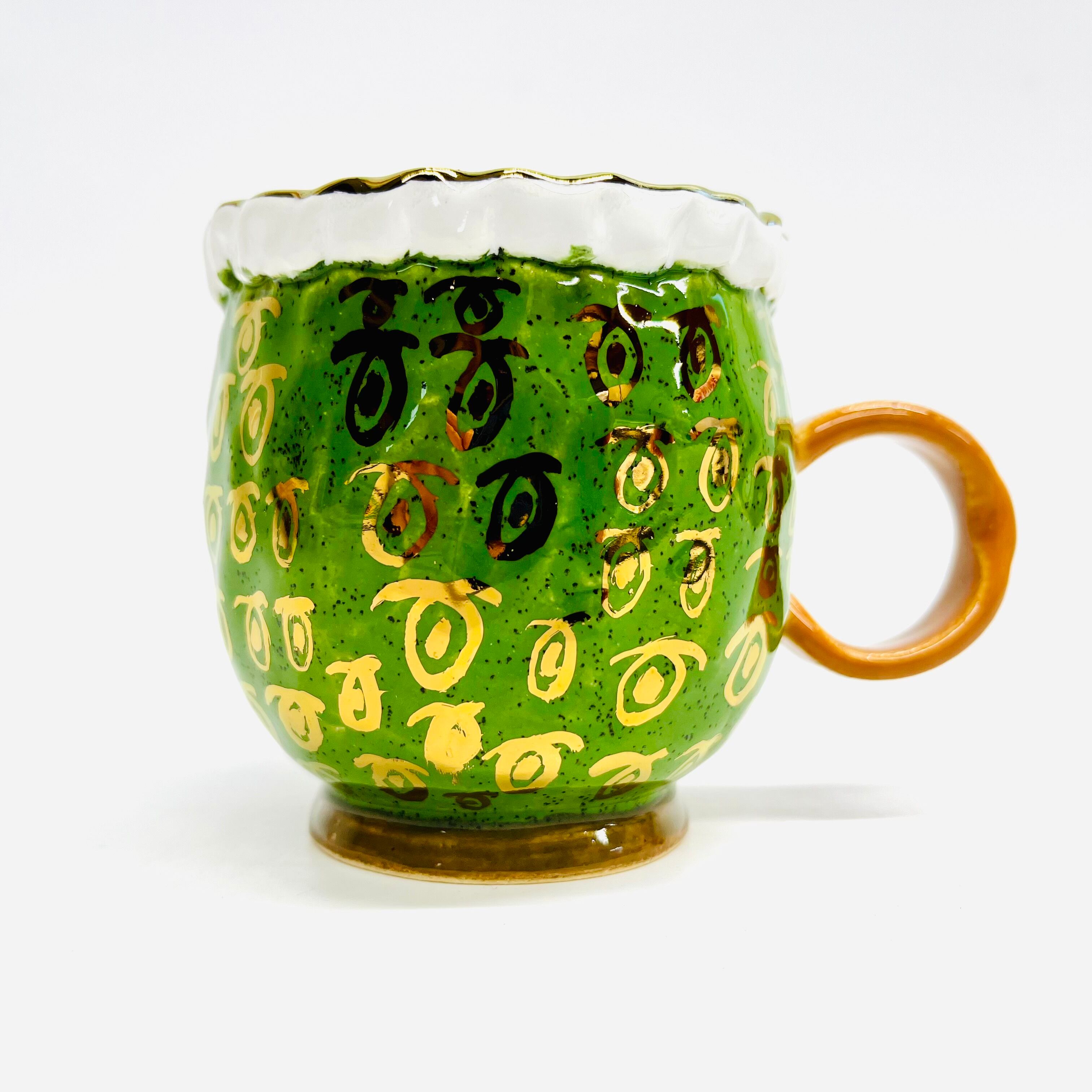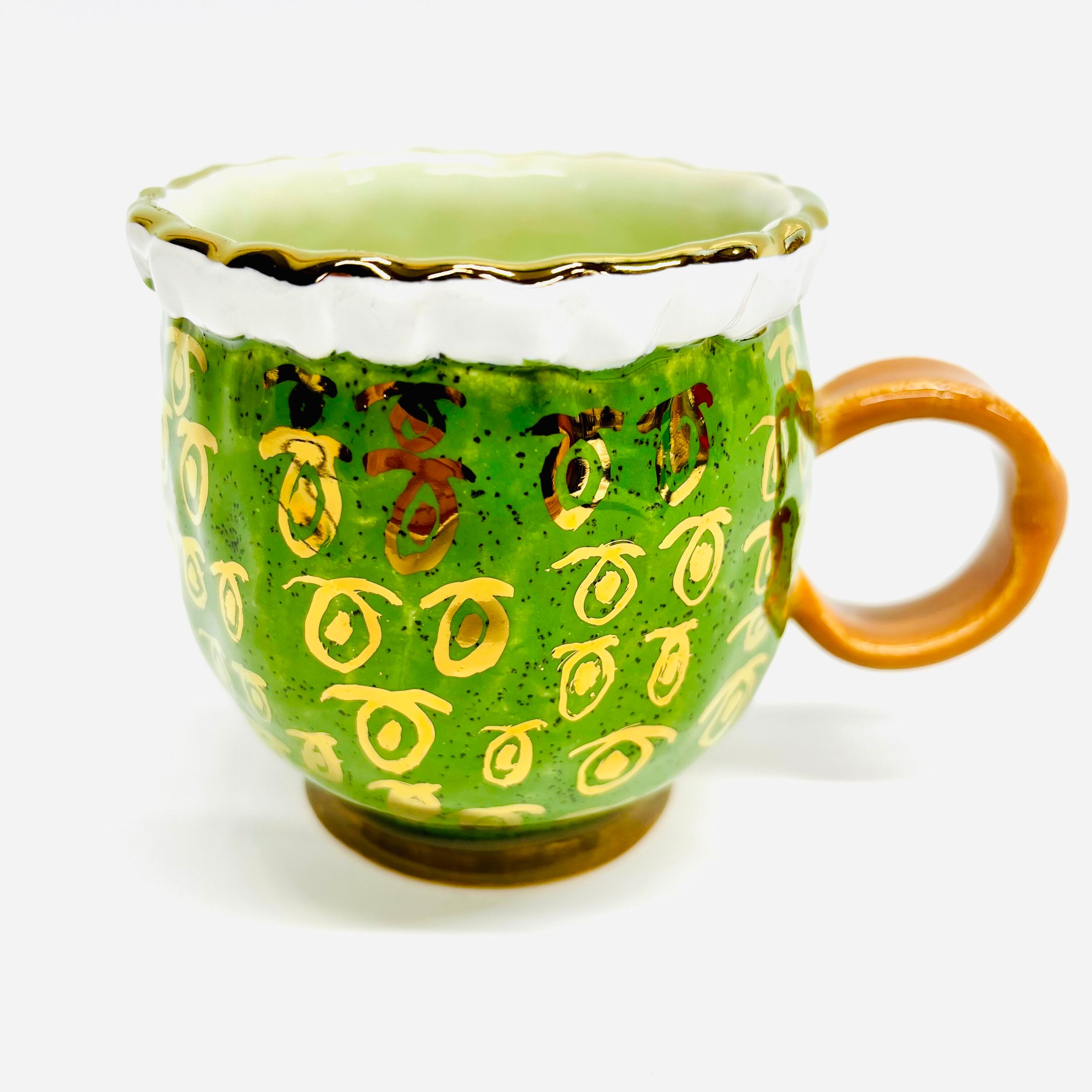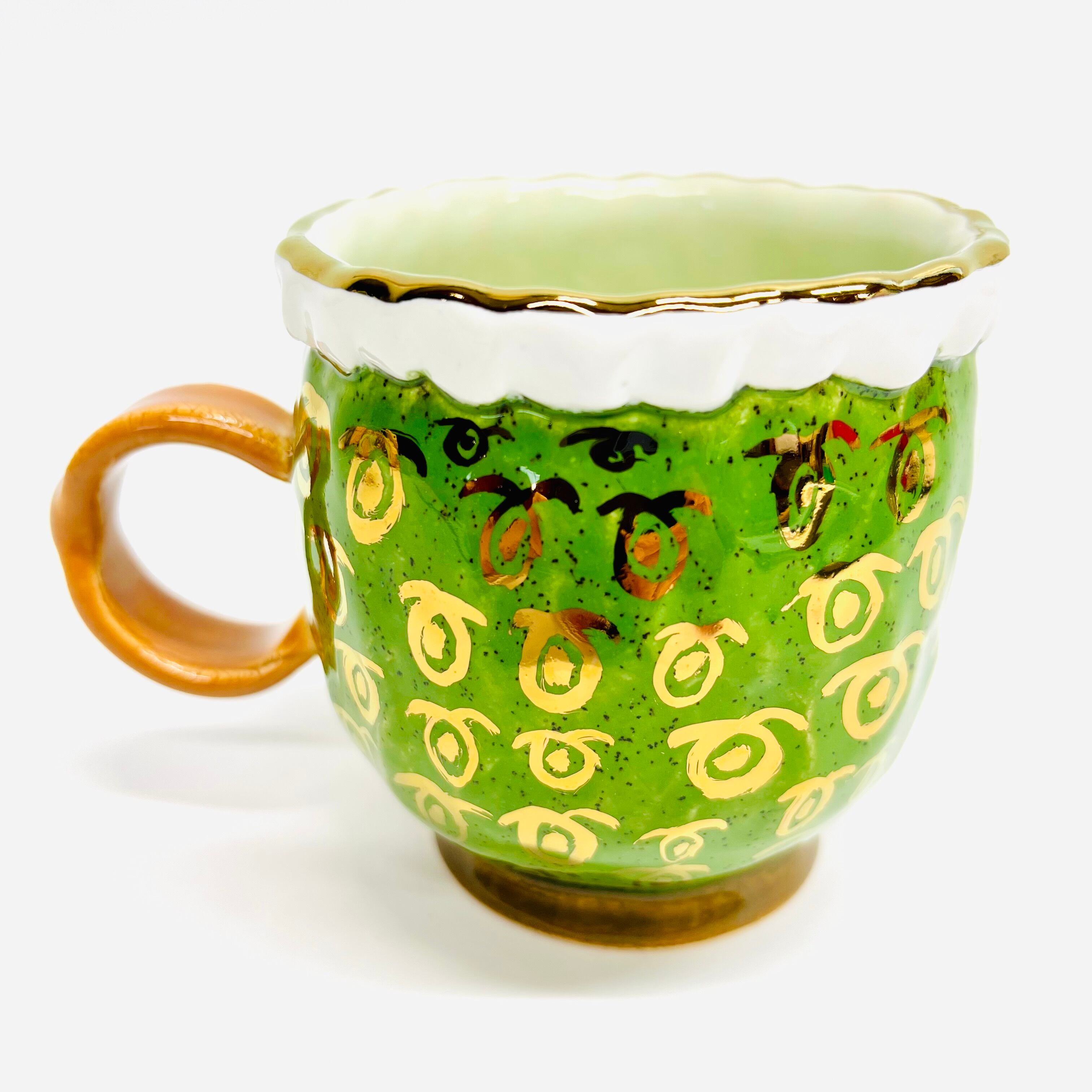 キウイ色の釉薬に種のつぶが金色に輝く一可愛いらしいカップです☆